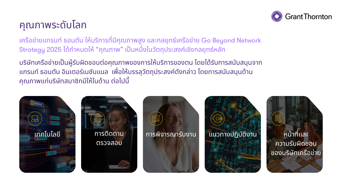 - มาตรฐานคุณภาพสูง: ร้อยละ 1% ของบริษัทได้รับผลการประเมิณคุณภาพในระดับ “น่าพึงพอใจ” พร้อมการนำแพลตฟอร์ม Leap ซึ่งเป็นเทคโนโลยีการตรวจสอบบัญชีบนระบบคลาวน์ที่พัฒนาโดยแกรนท์ ธอนตันมาใช้อย่างครบวงจร พร้อมติดตามคุณภาพแบบบูรณาการ
