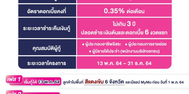 สำหรับในระยะแรกของโครงการ เพื่อเป็นการควบคุมและป้องกันปัญหาการแพร่ระบาดของ COVID-19 จึงเริ่มให้บริการแก่ลูกค้าธนาคารที่เปิดใช้แอป MyMo อยู่แล้วก่อนวันที่ 1 พ.ค. 2564 ซึ่งมีจำนวนมากกว่า 9 ล้านคน โดยเริ่มจากลูกค้าที่ได้รับผลกระทบที่อยู่ในพื้นที่สีแดงเข้ม 6 จังหวัด คือ กรุงเทพฯ นนทบุรี ปทุมธานี ชลบุรี สมุทรปราการ และเชียงใหม่ สามารถยื่นกู้ได้ทางแอป MyMo ในวันที่ 13 พ.ค. 2564 เป็นต้นไป หลังจากนั้นในระยะต่อไปจึงขยายให้บริการลูกค้าในทุกพื้นที่ทั่วประเทศ ซึ่งจะเริ่มในวันที่ 20 พ.ค. 2564 เป็นต้นไป ตามด้วยลูกค้ากลุ่มอื่นที่ไม่มีแอป MyMo กำหนดสิ้นสุดระยะเวลาโครงการวันที่ 31 ธันวาคม 2564 หรือจนกว่าจะครบจำนวนวงเงินโครงการ