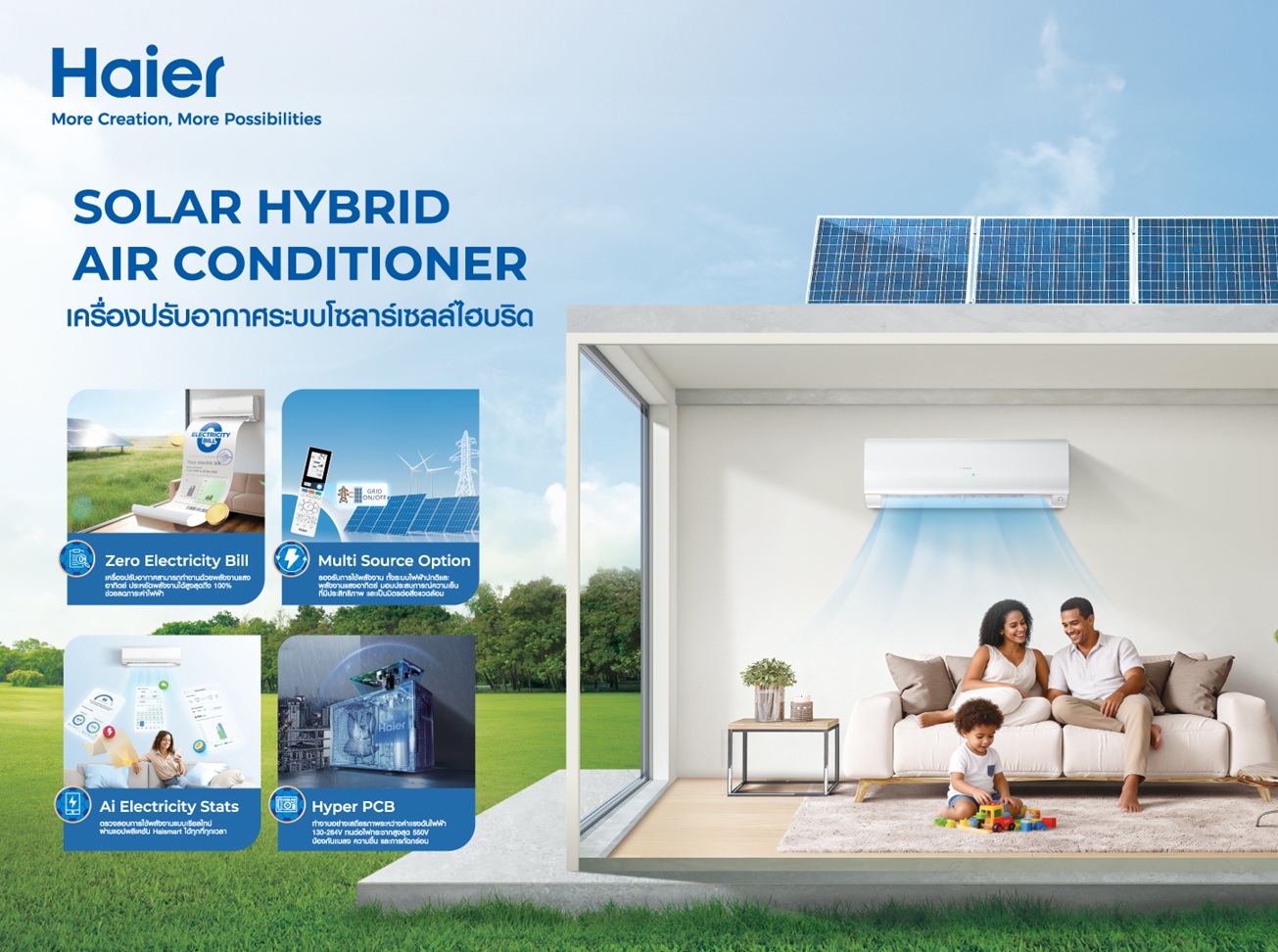 • พลิกเกมค่าไฟ ด้วย Solar Hybrid Air Conditioner นวัตกรรมแอร์พลังงานสะอาด สู่การใช้งานที่คุ้มค่ากว่า เครื่องปรับอากาศ Solar Hybrid นวัตกรรมใหม่ที่ผสานพลังงานแสงอาทิตย์เข้ากับระบบทำความเย็นอย่างลงตัว ช่วยยกระดับการใช้พลังงานภายในบ้านให้มีประสิทธิภาพมากยิ่งขึ้น ด้วยเทคโนโลยี DC Solar Power Inverter ที่รองรับการใช้พลังงานจากแสงอาทิตย์ควบคู่กับไฟฟ้าปกติ พร้อมระบบ Auto Balance Control ที่ช่วยบริหารจัดการพลังงานอย่างสมดุล และฟีเจอร์ Smart App      ที่สามารถติดตามการใช้พลังงานได้แบบเรียลไทม์ ตอบโจทย์ผู้บริโภคยุคใหม่ที่ต้องการทั้งความเย็นสบายและความคุ้มค่าในระยะยาว โดยช่วยลดภาระค่าไฟฟ้าอย่างมีประสิทธิภาพ พร้อมมุ่งสู่เป้าหมายค่าไฟ     0 บาท และรองรับการใช้พลังงานสะอาดในอนาคตอย่างยั่งยืน
