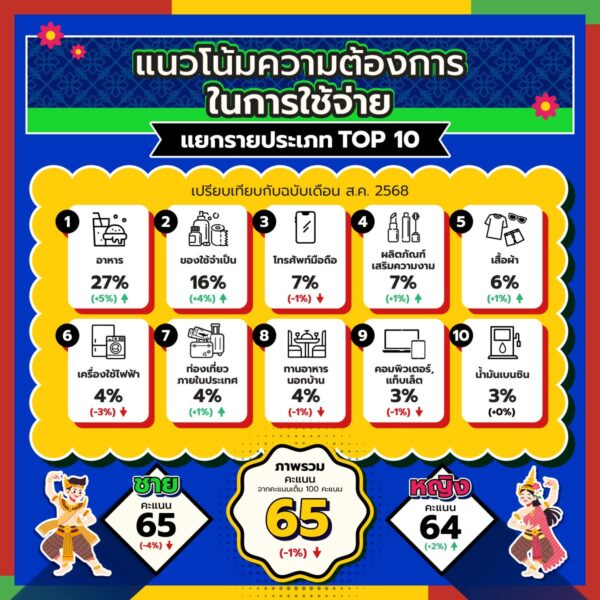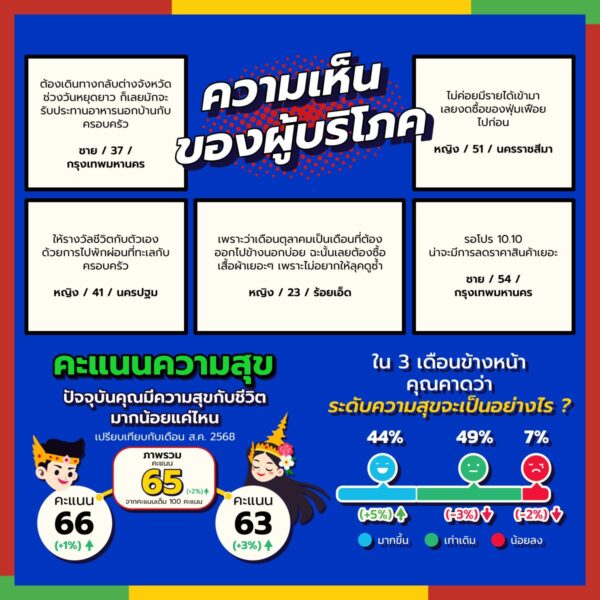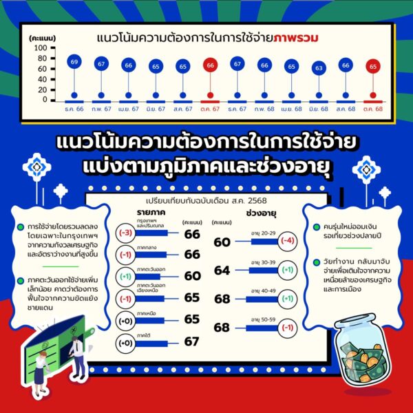 สถาบันวิจัยความเป็นอยู่ฮาคูโฮโด อาเซียน (ประเทศไทย) หรือ Hakuhodo Institute of Life and Living ASEAN (THAILAND) เผยผลสำรวจประจำเดือนตุลาคม พ.ศ. 2568 ไว้ว่า ภาพรวมในช่วงเดือน ตุลาคม นี้ แนวโน้มการใช้จ่ายลดลง 1 จุด เมื่อเทียบกับช่วงเดือนสิงหาคมที่ผ่านมา (65 vs 66) เป็นผลมาจากความกังวลเรื่องเศรษฐกิจและความขัดแย้งทั้งภายในประเทศและภายนอกประเทศ แต่คนไทยก็ยังใช้จ่ายเพื่อเติมความสุขใจ ไม่ว่าจะเป็นอาหาร ของใช้จำเป็น รวมไปถึงใช้จ่ายเพื่อการท่องเที่ยวในประเทศ ซึ่งสะท้อนให้เห็นถึงความต้องการดูแลใจและชีวิตประจำวันท่ามกลางความไม่แน่นอนที่เกิดขึ้นในปัจจุบัน