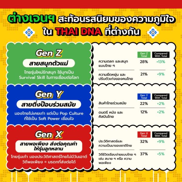 ซึ่งในผลสำรวจฉบับนี้เอง ได้รวบรวมผลสรุปของคนไทยแต่ละเจน ที่สะท้อนถึงรสนิยมของความภูมิใจใน THAI DNA ที่แตกต่างกัน แต่เป็นคนไทยหัวใจเดียวกันเอาไว้ว่า