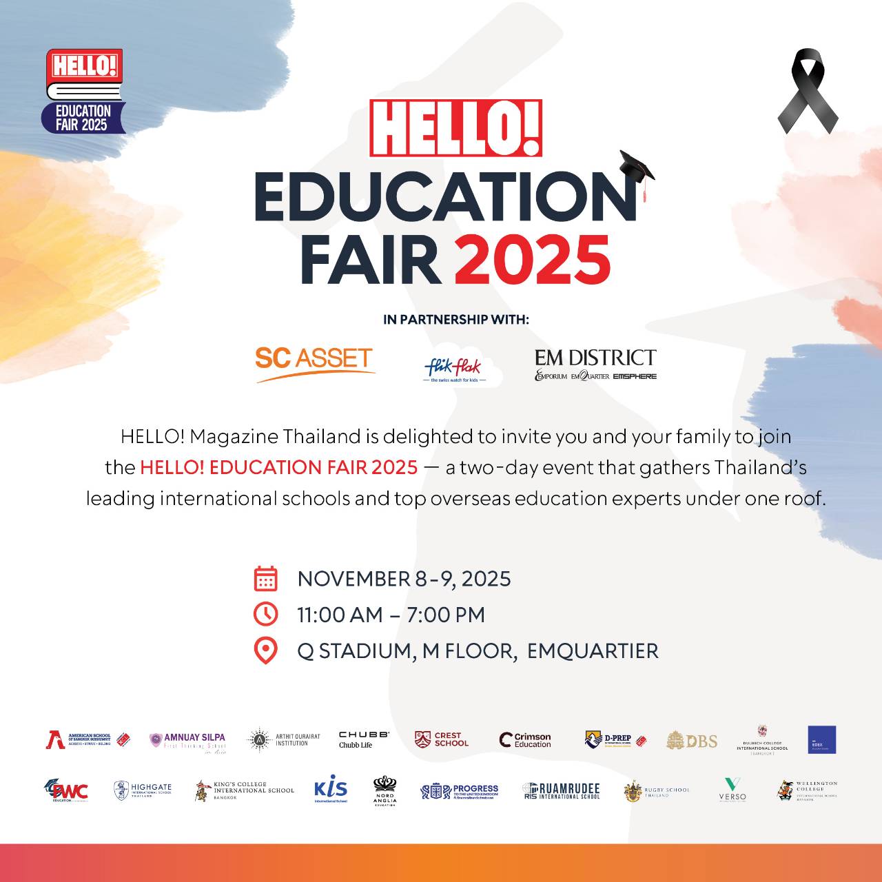 บริษัท เบอร์ด้า (ประเทศไทย) จำกัด ผู้จัดทำนิตยสาร HELLO! ร่วมกับ SC ASSET, Flik Flak และ EM DISTRICT เตรียมจัดมหกรรมแนะแนวการศึกษานานาชาติครั้งยิ่งใหญ่ “HELLO! EDUCATION FAIR 2025” รวบรวมโรงเรียนนานาชาติชั้นนำในประเทศไทย และผู้เชี่ยวชาญด้านการศึกษาต่อต่างประเทศระดับแนวหน้ามาไว้ในที่เดียว พร้อมกิจกรรมหลากหลาย เปิดโอกาสให้ทุกบ้านค้นหาโรงเรียนที่ใช่ เส้นทางการศึกษาเหมาะที่สุดสำหรับสมาชิกในครอบครัว ระหว่างวันที่ 8-9 พฤศจิกายน 2568 ณ Q Stadium ชั้น M เอ็มควอเทียร์