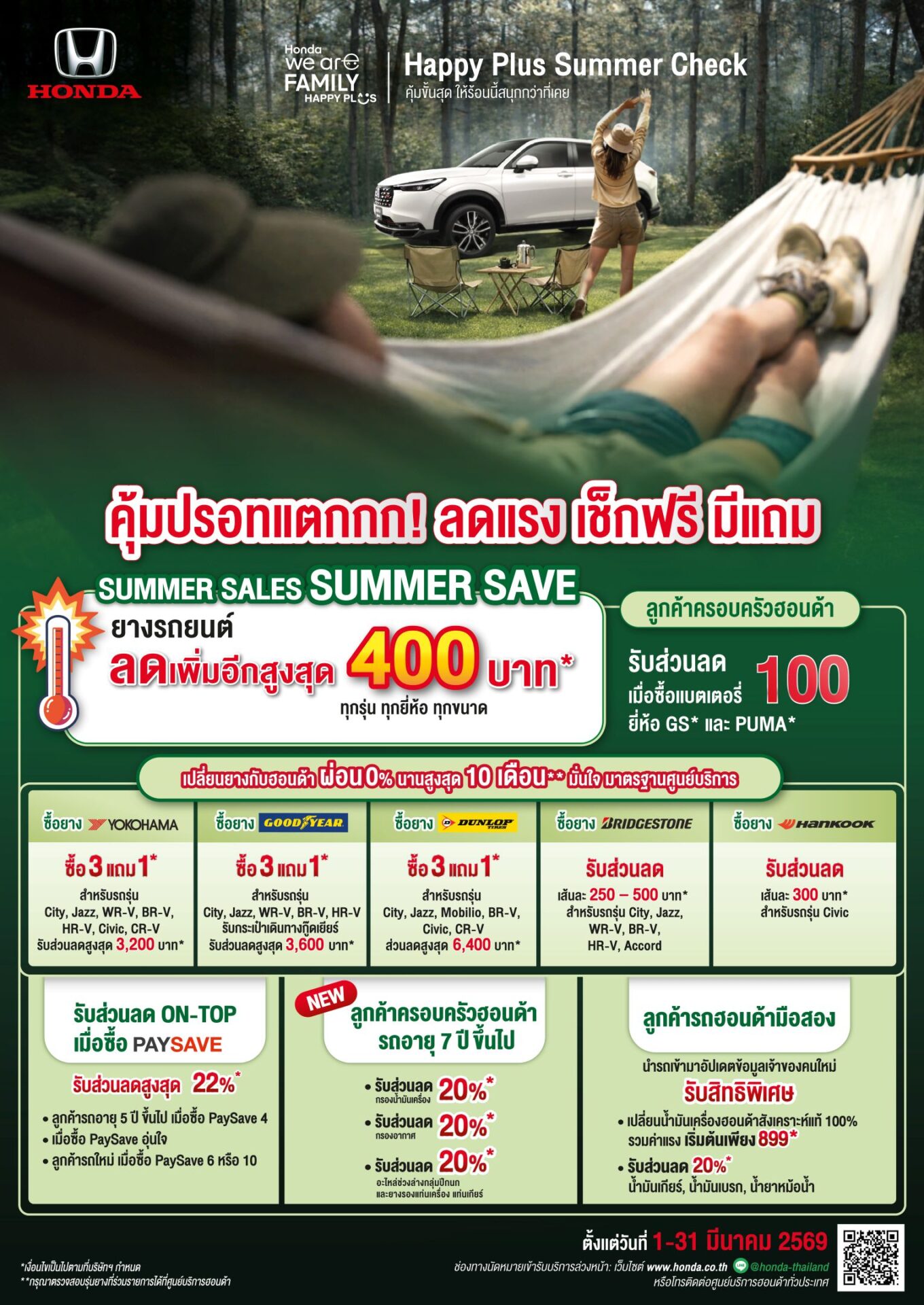 บริษัท ฮอนด้า ออโตโมบิล (ประเทศไทย) จำกัด พร้อมต้อนรับหน้าร้อนชวนครอบครัวฮอนด้าเดินทางพร้อมความอุ่นใจด้วยแคมเปญตรวจเช็กรถยนต์ Happy Plus Summer Check คุ้มขั้นสุดให้ร้อนนี้สนุกกว่าที่เคย เพราะทุกการเดินทางต้องมาพร้อมความปลอดภัย สำหรับลูกค้าครอบครัวฮอนด้าตรวจสภาพรถยนต์ฟรี ! และพิเศษสุดกับส่วนลดยางรถยนต์เพิ่มเติม !! สูงสุด 400 บาท* พร้อมทางเลือกผ่อนง่ายสบายกระเป๋า ดอกเบี้ย 0% สูงสุด 10 เดือน ขั้นต่ำ 2,000 บาท** เพียงนัดหมายและนำรถยนต์เข้ารับบริการที่ศูนย์บริการรถยนต์ฮอนด้าทั่วประเทศ ตั้งแต่วันที่ 1 – 31 มีนาคม 2569