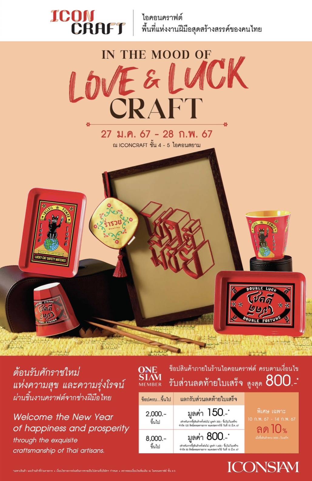 ไอคอนคราฟต์ (ICONCRAFT) พื้นที่งานฝีมือสุดสร้างสรรค์ของคนไทย ชั้น 4-5 ไอคอนสยาม ต้อนรับเทศกาลใหม่แห่งความสุข และความรุ่งโรจน์ กับแคมเปญ “IN THE MOOD OF LOVE & LUCK CRAFT” เทศกาลที่รวบรวมงานคราฟต์สุดสร้างสรรค์ เต็มไปด้วยกลิ่นอายของความรักและความโชคดี ให้คุณได้เลือกสรรของขวัญพิเศษ และเติมเต็มสไตล์ของคุณเอง พร้อมโปรโมชั่นสุดพิเศษ ตั้งแต่วันนี้ถึง 28 กุมภาพันธ์ 2567 ณ ไอคอนคราฟต์ ชั้น 4-5 ไอคอนสยาม