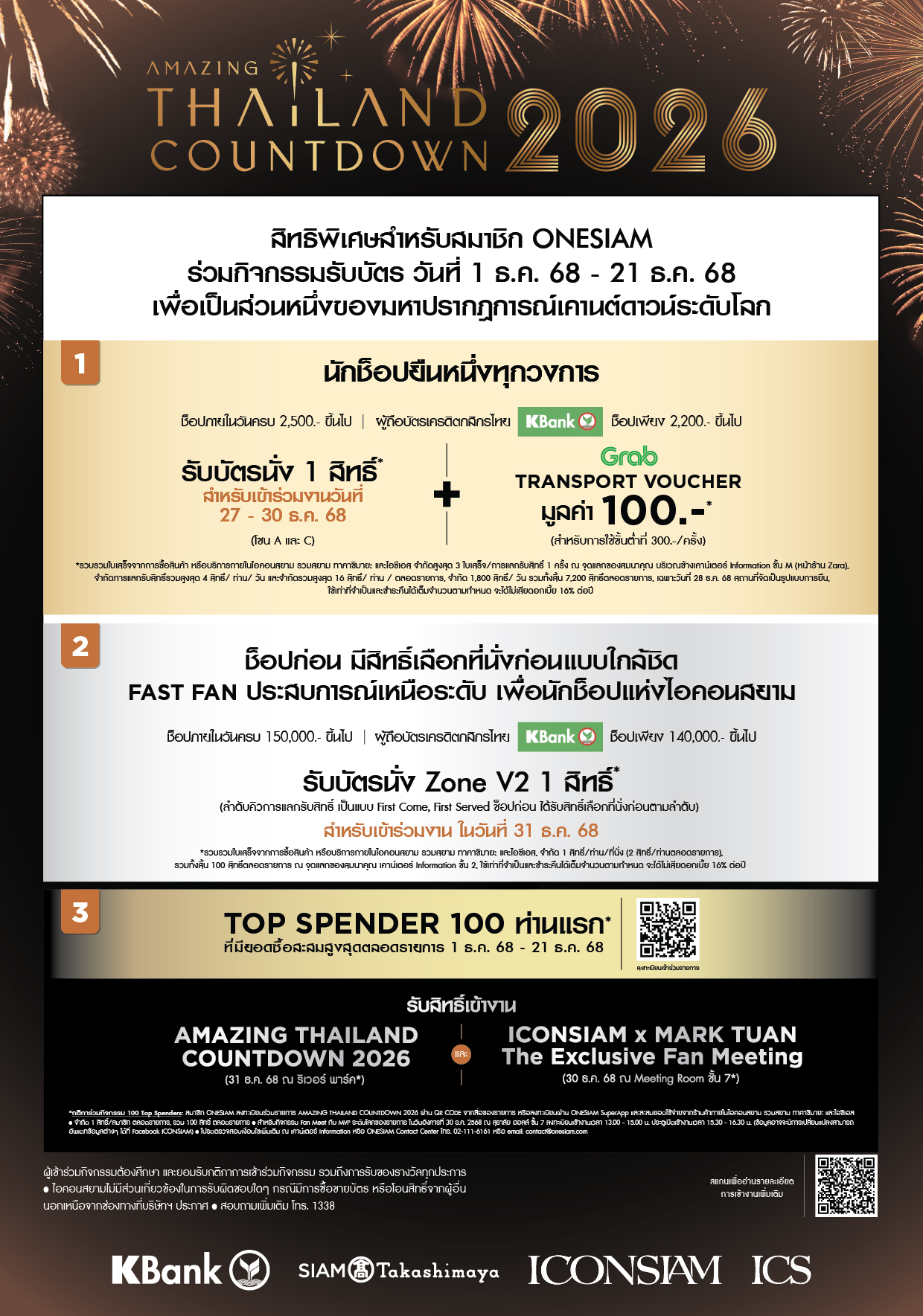 ทั้งนี้แคมเปญ AMAZING THAILAND COUNTDOWN 2026 มอบสิทธิพิเศษสำหรับลูกค้าไอคอนสยามและธนาคารกสิกรไทย ผู้เป็นสมาชิก ONESIAM รับสิทธิ์ร่วมโมเมนต์ระดับโลกในงาน Amazing Thailand Countdown 2026 ฟรี! ผ่านการสะสมยอดใช้จ่ายในไอคอนสยาม, สยาม ทาคาชิมายะ และไอซีเอส ระหว่างวันที่ 1-21 ธันวาคม 2568 โดย