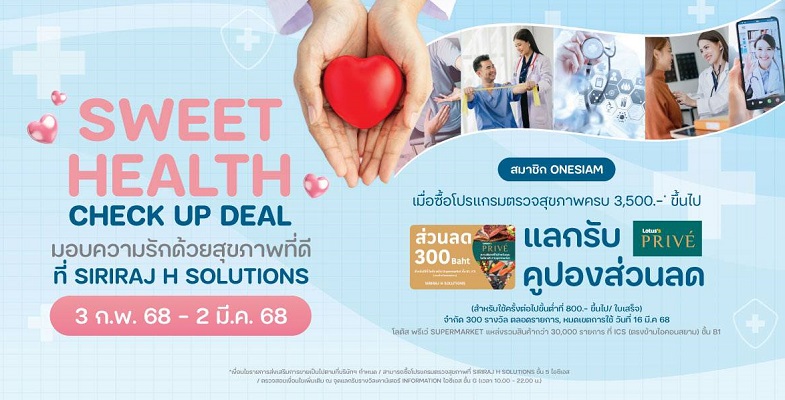 ต้อนรับเดือนแห่งความรัก ไอซีเอสจัดแคมเปญโปรโมชั่น Sweet Health Check-Up Deal มอบความรักด้วยสุขภาพที่ดี ที่ SIRIRAJ H SOLUTIONS ตั้งแต่วันที่ 3 กุมภาพันธ์ 2568 – 2 มีนาคม 2568 สำหรับสมาชิก ONESIAM ซื้อโปรแกรมตรวจสุขภาพครบ 3,500 บาทแลกรับคูปองส่วนลด โลตัส พรีเว่ มูลค่า 300 บาท สำหรับใช้ครั้งต่อไปขั้นต่ำที่ 800 บาทขึ้นไป/ใบเสร็จ มูลค่ารวมกว่า 1 แสนบาท