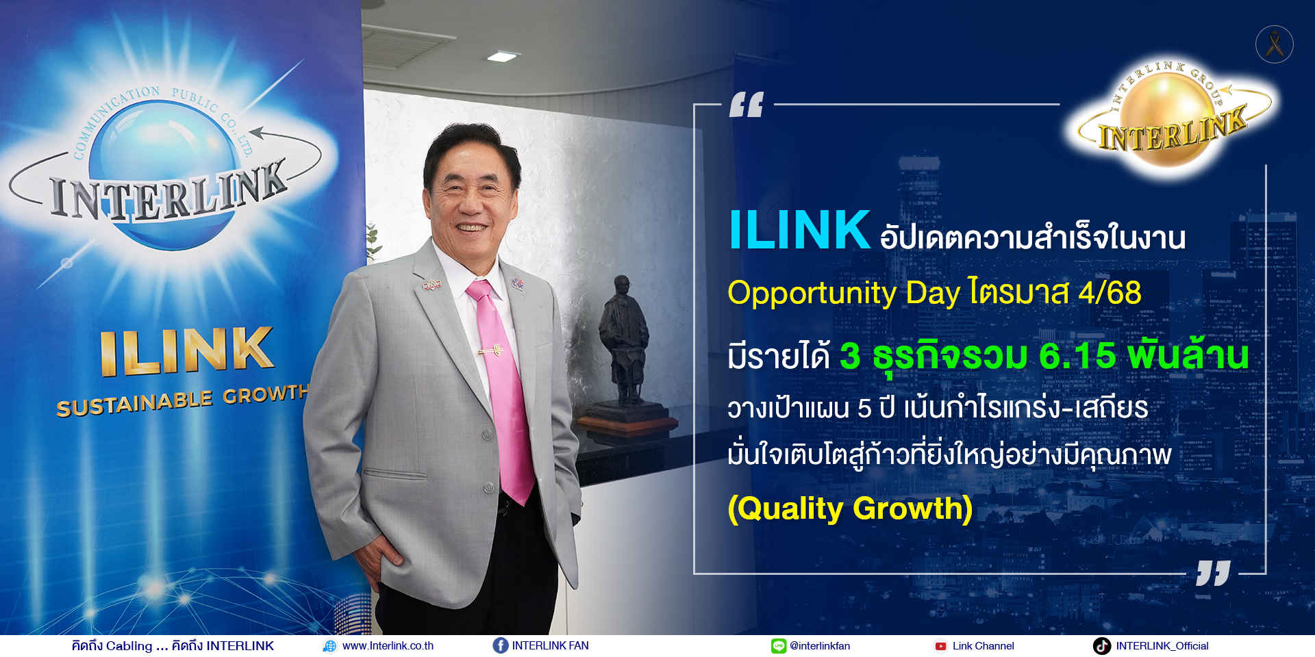 เป้าหมายความสำเร็จชัด สะท้อนความมั่นคง บริษัท อินเตอร์ลิ้งค์ คอมมิวนิเคชั่น จำกัด (มหาชน) หรือ ILINK ร่วมแถลงผลการดำเนินงานให้ข้อมูลกับนักลงทุน ในงานบริษัทจดทะเบียนพบผู้ลงทุน (Opportunity Day) ประจำไตรมาส 4/2568 ซึ่งจัดโดย ตลาดหลักทรัพย์แห่งประเทศไทย เพื่อรายงานผลประกอบการ และทิศทางธุรกิจต่อผู้ลงทุน โดยสะท้อนศักยภาพการบริหารจัดการที่แข็งแกร่งของบริษัทฯ ท่ามกลางสภาวะเศรษฐกิจโลกที่ยังมีความผันผวน พร้อมตอกย้ำกลยุทธ์การเติบโตอย่างยั่งยืนภายใต้แนวคิด Quality Growth หรือ การเติบโต อย่างต่อเนื่อง และยั่งยืนแบบมีคุณภาพ