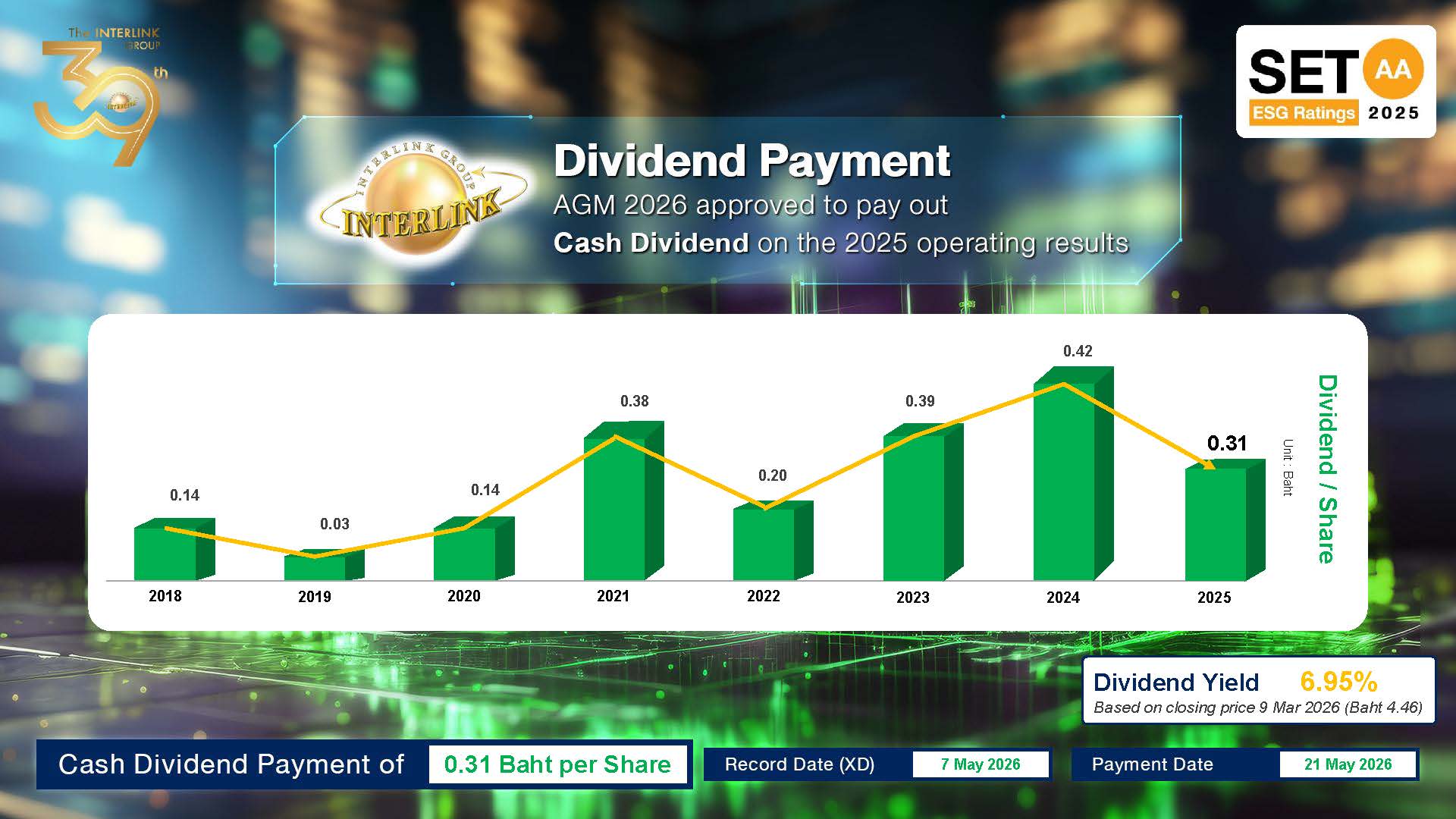 พร้อมกันนี้ ที่ประชุมคณะกรรมการบริษัท ครั้งที่ 2/2569 ได้มีมติอนุมัติการจ่ายเงินปันผลสำหรับผลการดำเนินงานปี 2568 ในอัตราหุ้นละ 0.31 บาท โดยกำหนดจ่ายเงินปันผลในวันที่ 21 พฤษภาคม 2569 อย่างไรก็ตาม การจ่ายเงินปันผลดังกล่าวยังต้องได้รับการอนุมัติจากที่ประชุมสามัญผู้ถือหุ้นประจำปี 2569 ต่อไป