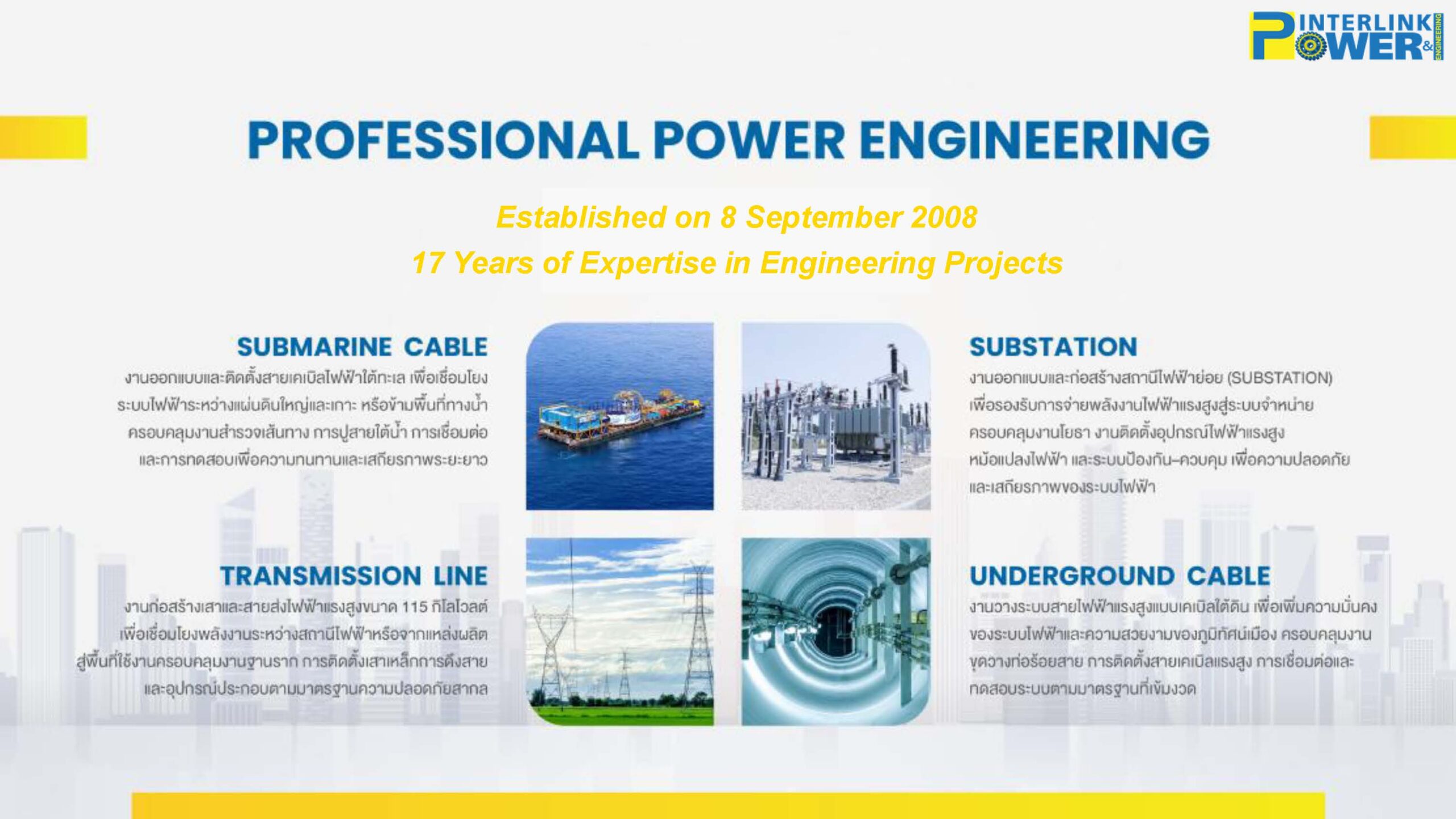 1. ธุรกิจวิศวกรรม และโครงการแบบครบวงจร (Turnkey EPC Engineering Business) ดำเนินงานโดย บริษัท อินเตอร์ลิ้งค์ เพาเวอร์ แอนด์ เอ็นจิเนียริ่ง จำกัด หรือ IPOWER ซึ่งเป็นธุกิจที่มีความเชี่ยวชาญด้านการดำเนินโครงการวิศวกรรมขนาดใหญ่ และมีความซับซ้อนสูง โดยต้องอาศัยองค์ความรู้ทางเทคนิค และประสบการณ์เฉพาะทาง เช่น โครงการสายเคเบิลใต้น้ำ โครงการสายเคเบิลใต้ดิน โครงการสถานีไฟฟ้าย่อย และโครงการระบบสายส่งไฟฟ้า