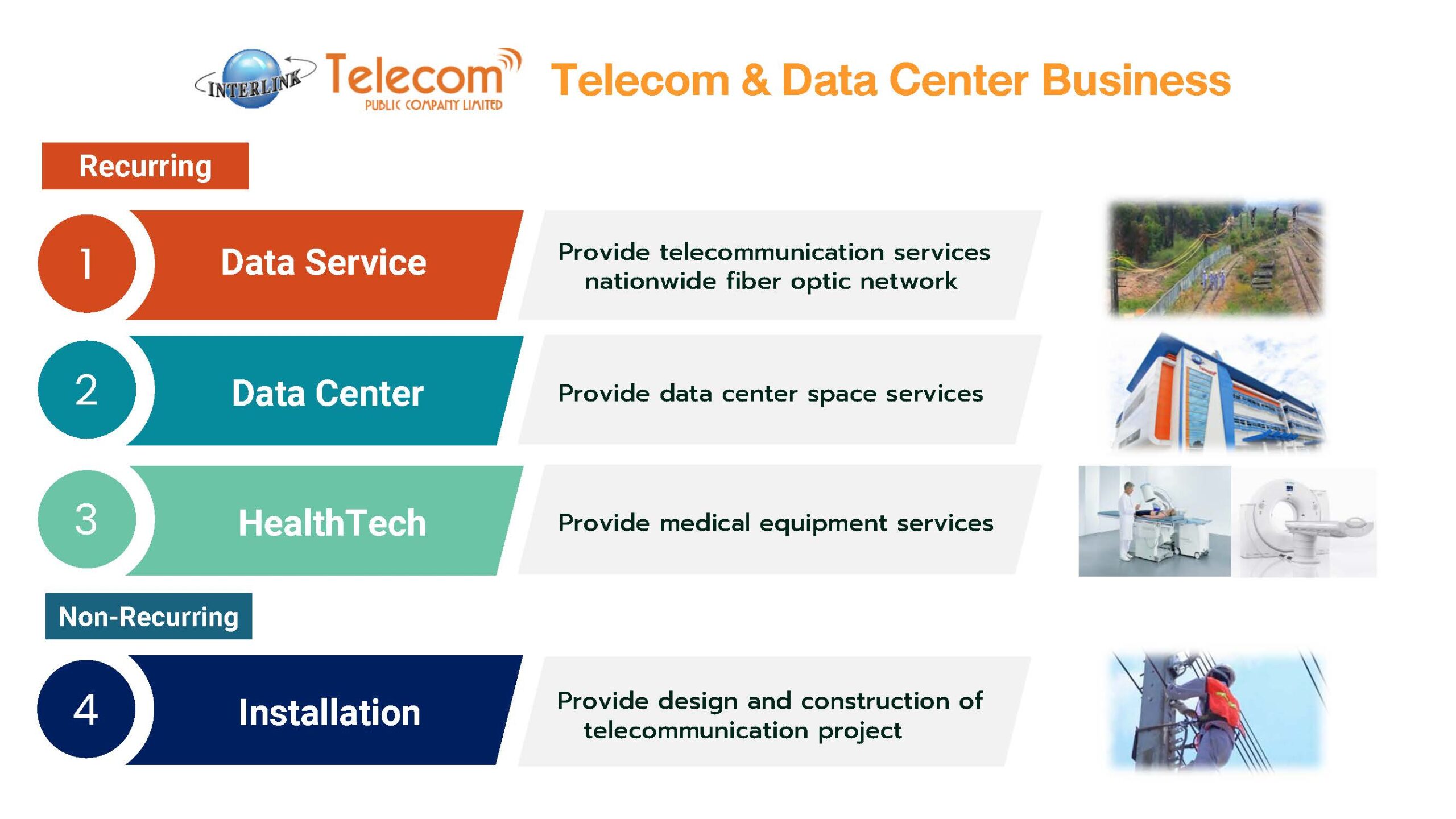 1. ธุรกิจโทรคมนาคม และดิจิทัลโครงสร้างพื้นฐาน (Telecom & Data Center Business)ดำเนินงานโดย บริษัท อินเตอร์ลิ้งค์ เทเลคอม จำกัด (มหาชน) หรือ ITEL เป็นผู้ให้บริการโครงข่ายไฟเบอร์ออปติกความเร็วสูงที่มีความเสถียร ครอบคลุมพื้นที่ 77 จังหวัดทั่วประเทศ พร้อมบริการเชื่อมต่อไปยังต่างประเทศตามความต้องการของลูกค้า รองรับการเติบโตของภาคธุรกิจในยุคเศรษฐกิจดิจิทัล และสนับสนุนการพัฒนาโครงสร้างพื้นฐานด้านการสื่อสารของประเทศอย่างเป็นรูปธรรม