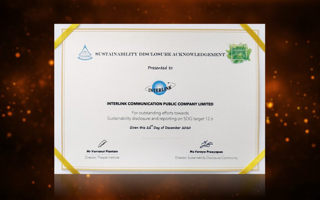 บริษัท อินเตอร์ลิ้งค์ คอมมิวนิเคชั่น จำกัด (มหาชน) “ILINK” เข้ารับรางวัล “Sustainability Disclosure Acknowledgement” (กิตติกรรมประกาศ) จากสถาบันไทยพัฒน์ ในพิธีมอบรางวัลการเปิดเผยข้อมูลความยั่งยืน ประจำปี 2563 (Sustainability Disclosure Community: SDC) โดยมี คุณวริษา อนันตรัมพร ผู้จัดการทั่วไป เป็นตัวแทนรับมอบ จากนายวรณัฐ เพียรธรรม ผู้อำนวยการสถาบันไทยพัฒน์ เมื่อวันที่ 22 ธันวาคม 2563 ที่ผ่านมา