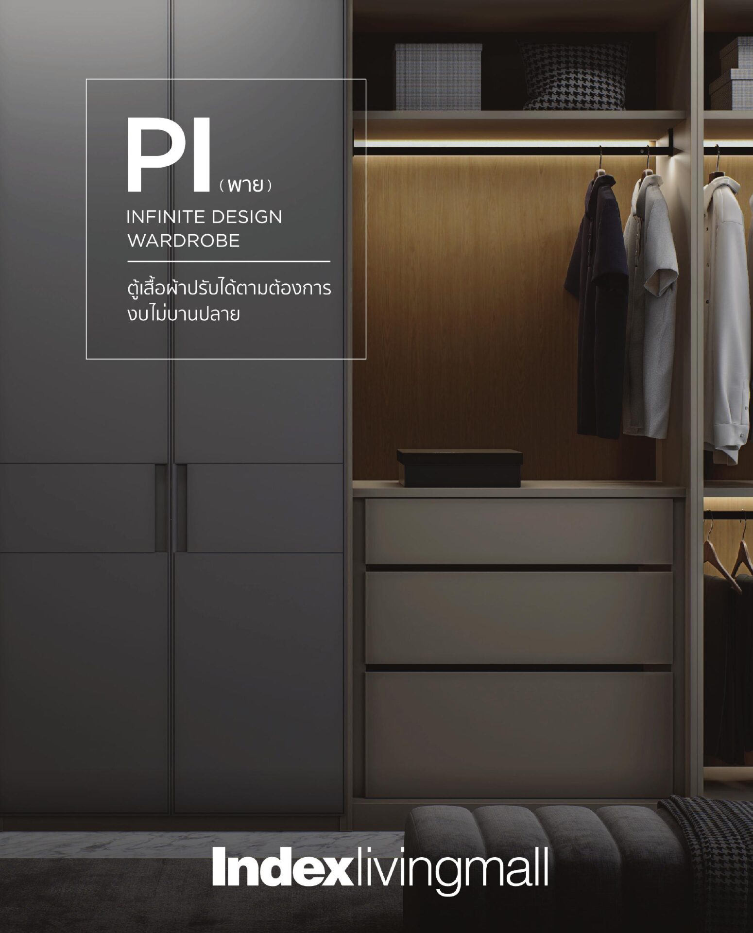 อินเด็กซ์ ลิฟวิ่งมอลล์ จึงหาทางออกด้วยทางเลือกใหม่ จึงเป็นที่มาของ “PI WARDROBE” INFINITE DESIGN WARDROBE ระบบตู้เสื้อผ้ากึ่งบิลต์อิน ที่เลือกได้เองทุกดีเทล งบไม่บานปลาย’ ครั้งแรกในรอบหลายปี โดยได้รับแรงบันดาลใจจากการนำ Function meets Design เพื่อเป็นตู้เสื้อผ้าที่สมบูรณ์แบบ และยังให้ความสำคัญกับคุณภาพของวัสดุทั้งหน้าบาน และฟิตติ้งที่ผ่านการคัดสรรมาอย่างดี เพื่อความแข็งแรงทนทาน รวมถึงทนต่อความชื้น รองรับการใช้งานที่ยาวนาน โดย ‘PI WARDROBE’ มาพร้อมกับความโดดเด่นที่สำคัญ คือ