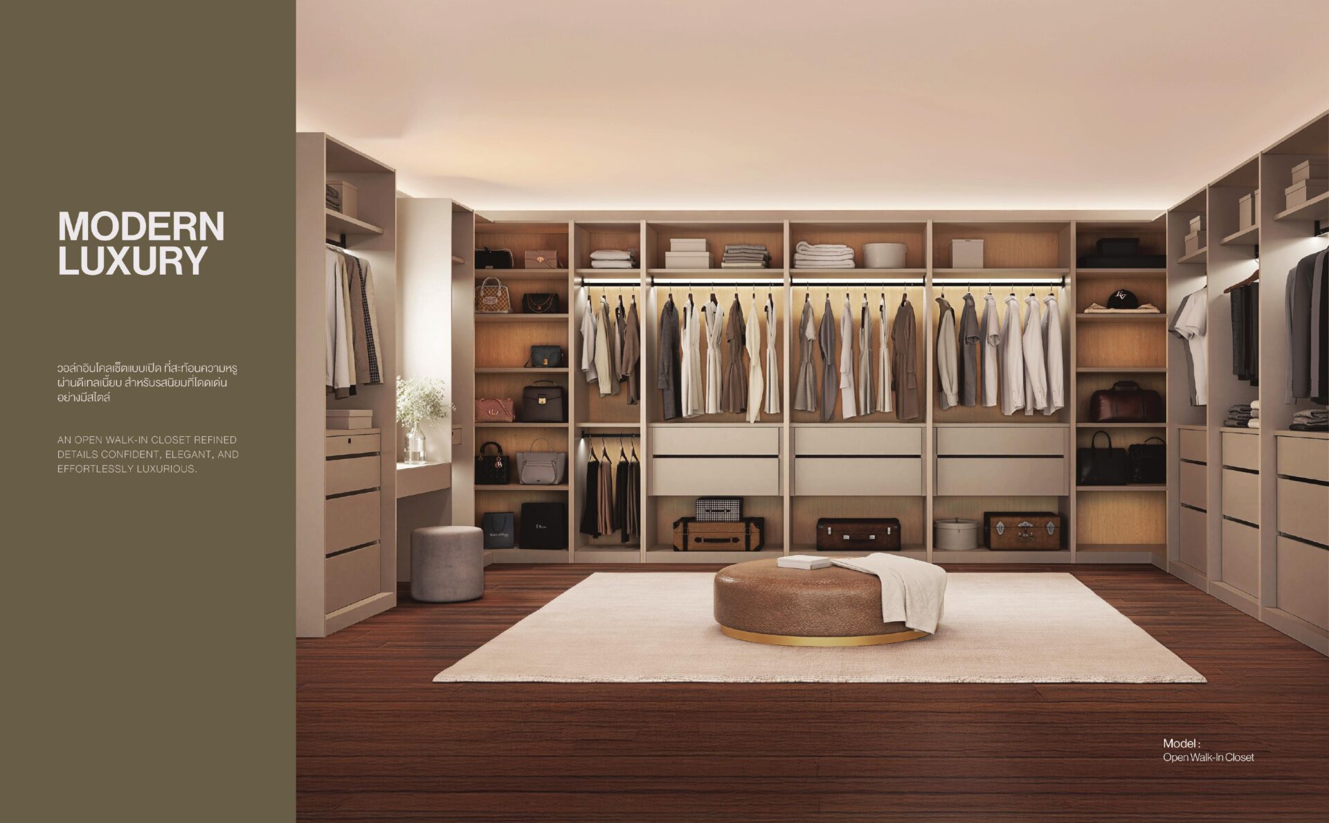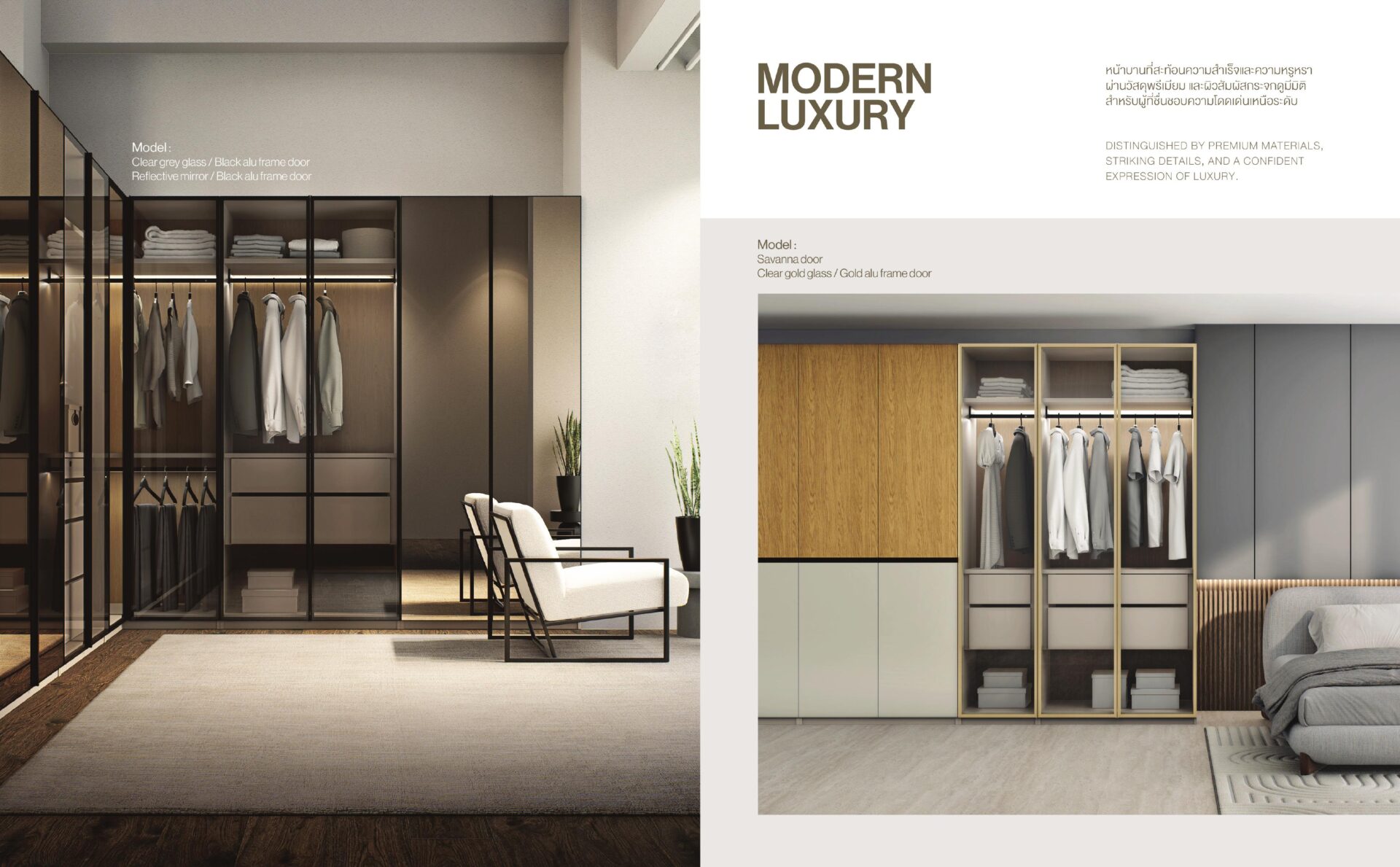 - Modern Luxury โดดเด่นด้วยวัสดุพรีเมียม เงางามมีมิติ ดีไซน์สะท้อนรสนิยมเหนือระดับ หรูหรา มาพร้อมตัวเลือกวัสดุหน้าบานหลากหลาย ทั้งเมลามีนคุณภาพสูง กระจกนิรภัย และลามิเนตลายไม้พรีเมียม สามารถเลือกได้ทั้ง Open Walk in Closet เพื่อความโปร่ง หรือ Reflect Mirror เพื่อความเรียบร้อยหรูหรา