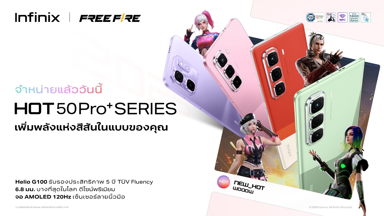 สำหรับสมาร์ทโฟน HOT 50 Series ประกอบด้วยรุ่น HOT 50 Pro+, HOT 50 Pro, HOT 50 และ HOT 50i โดยในรุ่น HOT 50 Pro+ มาพร้อมกับสีสันสุดพิเศษที่รังสรรค์ขึ้นใหม่ ได้แก่ Aurora Green (เขียว), Rising Red (แดง), และBlossom Pink (ชมพู) และยังคงฟังก์ชันการใช้งานจัดเต็มเพื่อประสิทธิภาพสูงสุดในการใช้งาน อาทิ ชิปเซ็ต Helio G100 ที่มอบประสิทธิภาพสูงสุดและได้รับการรับรองจาก TÜV SÜD สำหรับการใช้งานที่ลื่นไหลและยาวนานกว่า 60 เดือน ตอบสนองแบบ 16X Ultra-Resolution Touch และอัตราการรีเฟรชเรทสูงถึง 90FPS สำหรับ Free Fire มาในดีไซน์ Glimmer Ladder Design ที่ผสานสองวัสดุสุดล้ำอย่าง NanoFlex Fiber Leather เพื่อมอบความทนทานในการใช้งาน ตัวเครื่องบางเพียง 0.55 มม. ทำให้เป็นสมาร์ทโฟน 3D-Curved SlimEdge จอ AMOLED ที่บางที่สุดอีกด้วย ทั้งหมดนี้สะท้อนการออกแบบเพื่อผู้ใช้งานที่ผสมผสานทั้งดีไซน์เหนือระดับและประสิทธิภาพทรงพลังไว้ด้วยกันอย่างลงตัว ด้านรุ่น HOT 50i ก็มาพร้อมกับสีสันใหม่อย่าง Dreamy Purple (ม่วง) และฝาหลังดีไซน์แบบ Dualscape เพื่อสะท้อนความงดงามและเพิ่มลูกเล่นให้กับตัวเครื่องโดดเด่นมากยิ่งขึ้น
