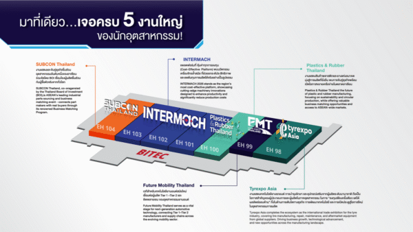 ความพิเศษของ INTERMACH 2026 คือการจัดร่วมกับอีก 4 งานอุตสาหกรรมสำคัญ ในพื้นที่เดียวกัน ณ ศูนย์นิทรรศการและการประชุมไบเทค ได้แก่ SUBCON Thailand, Plastics and Rubber Thailand, Future Mobility Thailand และ TyreXpo Asia สร้างโอกาสให้นักอุตสาหกรรมสามารถเข้าถึงเทคโนโลยีและโซลูชันที่ครอบคลุมอุตสาหกรรมการผลิตตั้งแต่ต้นน้ำ กลางน้ำ จนถึงปลายน้ำ ได้ภายในงานเดียว เพิ่มความคุ้มค่าในการเข้าชม และเปิดมุมมองใหม่ในการเชื่อมโยงเครือข่ายทางธุรกิจอย่างรอบด้าน