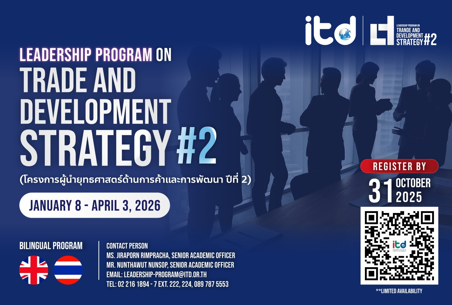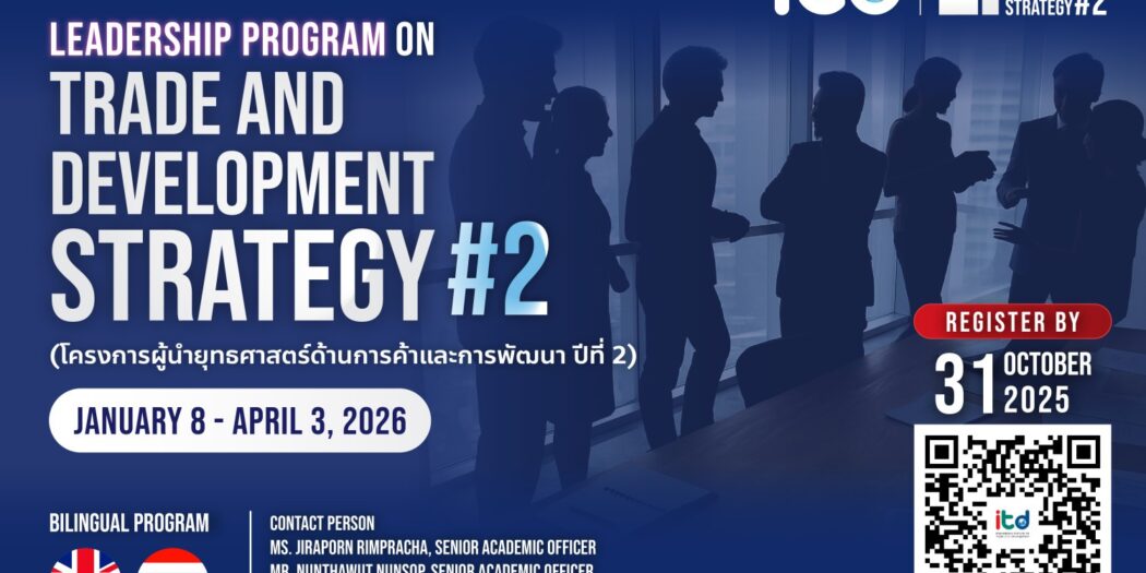 สถาบันระหว่างประเทศเพื่อการค้าและการพัฒนา (องค์การมหาชน) หรือ ITD เปิดโครงการผู้นำยุทธศาสตร์ด้านการค้าและการพัฒนา รุ่นที่ 2 หรือ LTD (Leadership Program on Trade and Development Strategy: LTD#2) ภายใต้แนวคิด “A Call to Leadership: Navigating a New Era of Global Trade” มุ่งเปิดพื้นที่ให้ ผู้ที่มีส่วนได้ส่วนเสียจากภาครัฐและเอกชน ได้ร่วมกัน แลกเปลี่ยนความคิดเห็น ประสานแนวทาง และเสนอข้อกำหนดเชิงนโยบายที่ตอบโจทย์อนาคตของประเทศไทยในบริบทเศรษฐกิจโลกที่เปลี่ยนแปลงอย่างรวดเร็ว โครงการ LTD#2 เปิดรับสมัครแล้วตั้งแต่วันนี้ถึงวันที่ 31 ตุลาคม 2568 รับจำนวนจำกัดเพียง 80 ท่าน โดยมีกำหนดการอบรมเชิงปฏิบัติการระหว่างวันที่ 8 มกราคม – 3 เมษายน 2569 ผู้เข้าร่วมจะกลายเป็นส่วนหนึ่งของเครือข่ายผู้นำทางการค้าระดับประเทศ ที่พร้อมขับเคลื่อนนโยบายและเศรษฐกิจไทยให้ก้าวไกลบนเวทีโลก ผู้สนใจสามารถดูรายละเอียดเพิ่มเติมและสมัครเข้าร่วมโครงการได้ที่ เว็บไซต์: www.itd.or.th เฟซบุ๊ก: International Institute for Trade and Development (ITD)