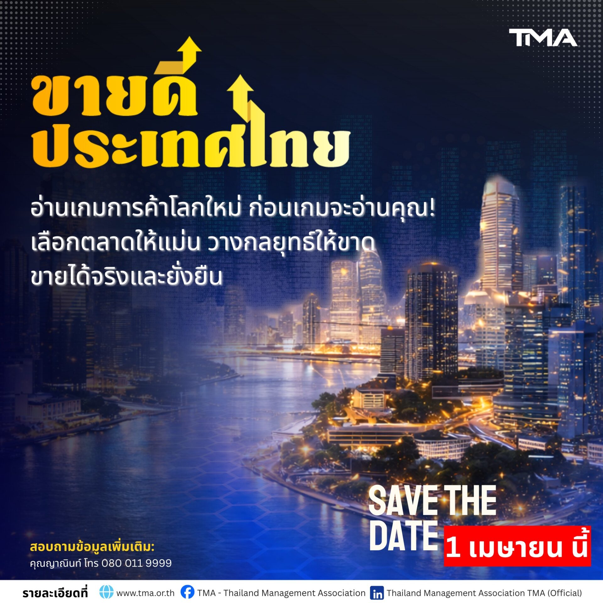 งาน “ขายดีประเทศไทย: ของดีไทย สู่ตลาดโลก” จะจัดขึ้น ในวันพุธที่ 1 เมษายน 2569 เวลา 09.00 – 16.30 น. ผู้สนใจสามารถดูรายละเอียดงานได้ที่ www.tma.or.th งานนี้เหมาะสำหรับผู้บริหารและผู้ประกอบการที่ต้องการมากกว่าแค่การอยู่รอด แต่พร้อมจะอ่านเกมให้ขาด และขายให้โลกซื้อ