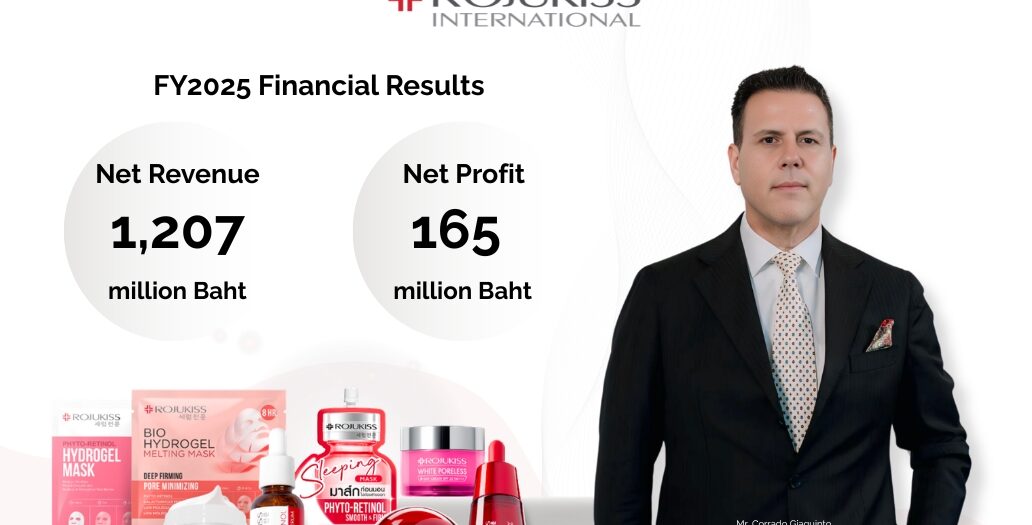 โรจูคิส อินเตอร์เนชั่นแนล จำกัด (มหาชน) (“KISS”) กวาดรายได้ไตรมาส 4 เติบโต 5% และมีกำไรสุทธิเติบโตโดดเด่น 28% ขณะที่รายได้รวมทั้งปีอยู่ที่ 1,207 ล้านบาท และมีกำไรสุทธิ 165 ล้านบาท เพิ่มขึ้น 3% เมื่อเทียบกับปีก่อน (YoY) สำหรับปี 2569 บริษัทได้วางกลยุทธ์การเติบโตหลัก โดยมุ่งเน้นการพัฒนานวัตกรรมสินค้าอย่างต่อเนื่อง ขยายตลาดต่างประเทศสู่ 8 ประเทศภายในเดือนธันวาคม 2569 และต่อยอดการขยายกลุ่มผลิตภัณฑ์ในหมวดผลิตภัณฑ์ทำความสะอาดผิวหน้าและครีมกันแดด