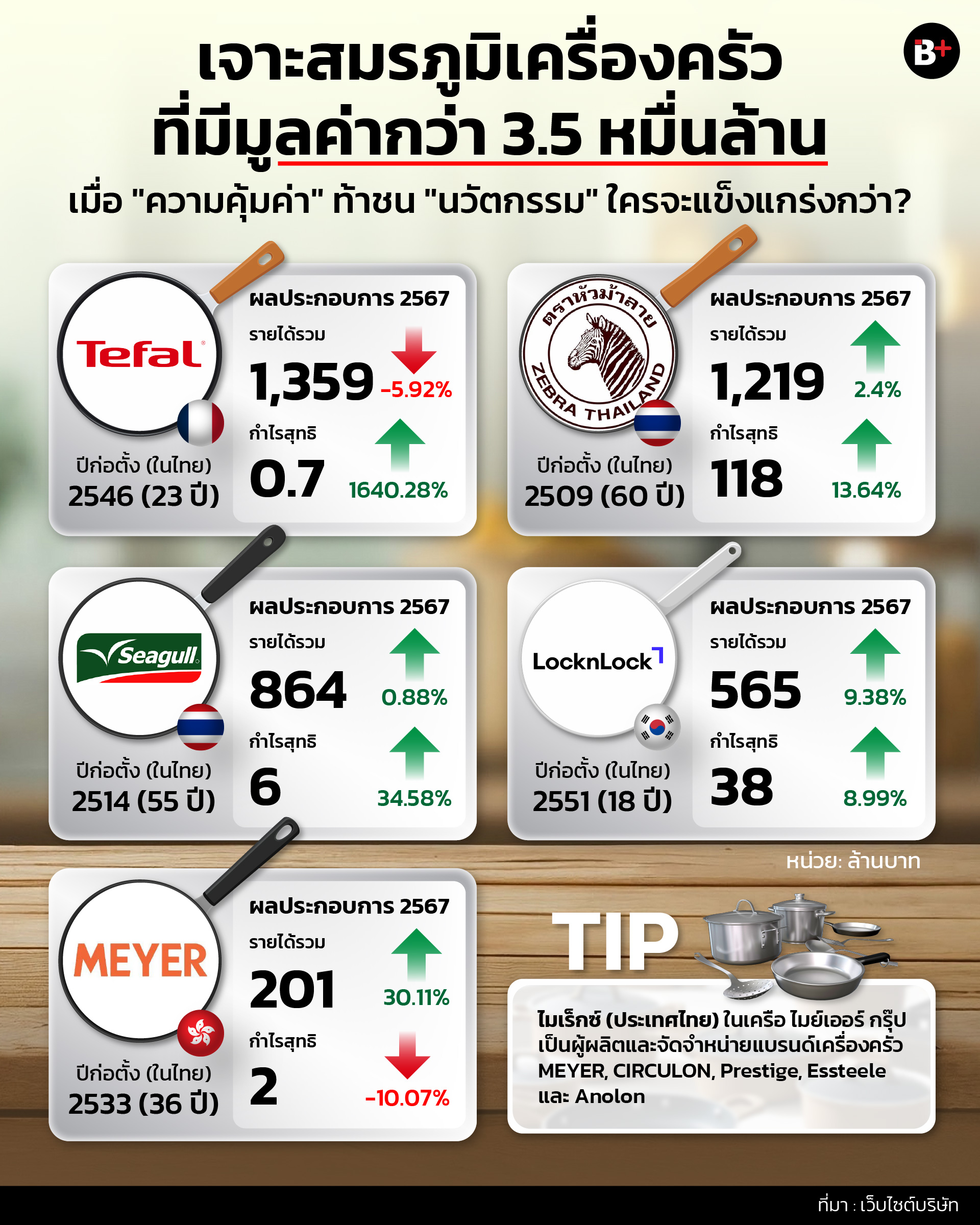 ในฝั่งเครื่องครัวระดับพรีเมียม Meyer ยังคงเน้นจุดขายด้านคุณภาพวัสดุและมาตรฐานการผลิตระดับสากล โดยปี 2567 มีรายได้เติบโตสูงถึง 30.11% อย่างไรก็ตาม กำไรสุทธิกลับลดลง 10.07% เหลือ 2 ล้านบาท สะท้อนความท้าทายในตลาดพรีเมียมที่ต้องแบกรับทั้งต้นทุนการผลิตและการสร้างแบรนด์ในระดับสูง