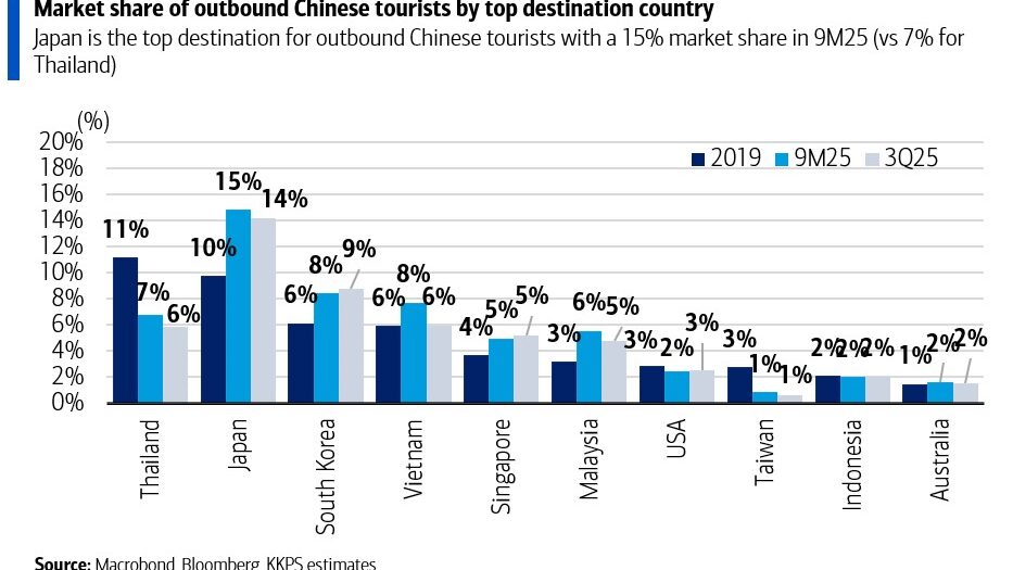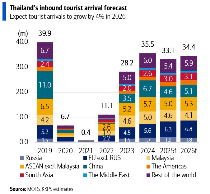 จากฐานที่ต่ำในปี 2025 อันเนื่องมาจากจำนวนนักท่องเที่ยวจีนที่อ่อนแอ การท่องเที่ยวในปี 2026 น่าจะเห็นสถานการณ์พลิกฟื้น จากการที่การท่องเที่ยวขาออกของจีนอาจเปลี่ยนทิศทางจากญี่ปุ่นมาสู่ประเทศไทย หลังจากข้อพิพาทล่าสุดกับญี่ปุ่น ส่งผลให้ บริษัทหลักทรัพย์ เกียรตินาคินภัทร จำกัด (มหาชน) (KKPS) ประเมินว่าจำนวนนักท่องเที่ยวรวมจะฟื้นตัวและเติบโต 4% เป็น 34.4 ล้านคนในปี 2026 โดยมีโอกาสเพิ่มเติมจากนักท่องเที่ยวจีน โดย KKPS คาดว่าส่วนแบ่งตลาดของไทยในนักท่องเที่ยวจีนขาออกจะเพิ่มจาก 7% ในช่วงเก้าเดือนแรกของปีนี้ เข้าใกล้ระดับ 11% ที่เคยเห็นในปี 2019 ซึ่งจะช่วยลดช่องว่างกับญี่ปุ่นที่มีส่วนแบ่งตลาด 15% ในช่วงเก้าเดือนแรกของปีนี้ โดยในเดือนธันวาคม ส่วนแบ่งตลาดของญี่ปุ่นลดลงจาก 15% เหลือ 13% ขณะที่ของไทยเพิ่มจาก 7% เป็น 9% นอกจากนี้ บริษัทท่าอากาศยานไทย จำกัด (มหาชน) หรือ AOT ได้ประกาศตารางการบินฤดูหนาวล่าสุด ซึ่งบ่งชี้ถึงจำนวนเที่ยวบินที่เพิ่มขึ้น 17% จากปีที่แล้ว