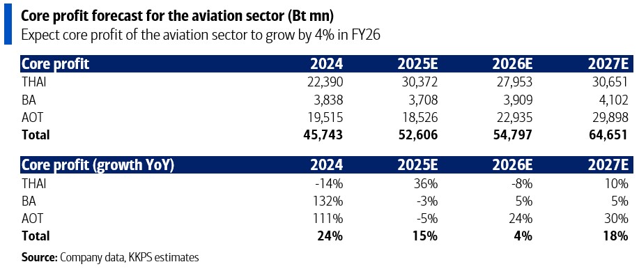 ภาคการบินของไทยควรได้รับประโยชน์จากจำนวนผู้โดยสารที่เพิ่มขึ้นราว 3-6% สำหรับ AOT บริษัทการบินไทย จำกัด (มหาชน) หรือ THAI และบริษัทการบินกรุงเทพ จำกัด (มหาชน) หรือ BA โดยกำไรของ AOT คาดว่าจะเพิ่มขึ้น 24% ในปีงบประมาณ 2026 หนุนโดยค่าบริการผู้โดยสารขาออกระหว่างประเทศ (PSC) ที่สูงขึ้น กำไรของ BA คาดว่าจะเติบโต 5% จากการโตอย่างต่อเนื่องของเส้นทางสมุย ในทางตรงกันข้าม กำไรของ THAI คาดว่าจะลดลง 8% จากต้นทุนที่สูงขึ้นและการแข่งขันที่รุนแรงขึ้น