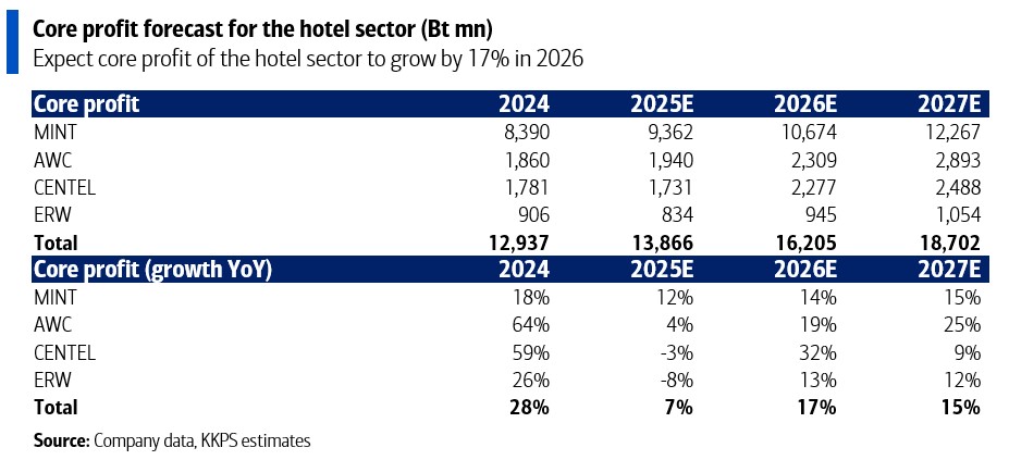 แนวโน้มรายได้ต่อห้องพักที่พร้อมให้บริการ (RevPAR) ของโรงแรมในประเทศไทยคาดว่าจะฟื้นตัวในไตรมาส 4 หนุนโดยการเติบโตที่แข็งแกร่งของนักท่องเที่ยวยุโรป โดยเฉพาะโรงแรมในต่างจังหวัด ขณะที่ RevPAR โรงแรมในกรุงเทพฯ ยังคงติดลบราวระดับเลขตัวเดียวกลางๆ แต่มีโอกาสฟื้นตัวในไตรมาส 1 ปีหน้า จากการกลับมาของนักท่องเที่ยวจีน KKPS คาดว่า RevPAR ในต่างประเทศของโรงแรมในยุโรปและมัลดีฟส์จะเติบโตต่อเนื่องในปี 2026 โดยมัลดีฟส์จะเติบโตโดดเด่นจากฐานที่ต่ำ บริษัทโรงแรมเซ็นทรัลพลาซ่า จำกัด (มหาชน) หรือ CENTEL คาดว่าจะเห็นการเติบโตของกำไรสูงสุดในกลุ่ม ราว 2 เท่าของคู่แข่ง หรือประมาณ 32% ในปี 2026 หนุนโดยการพลิกฟื้นผลประกอบการของธุรกิจในมัลดีฟส์
