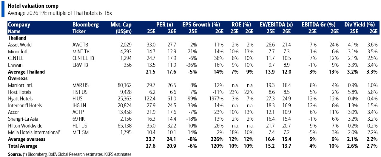KKPS มองว่าสถิติการดำเนินงานระยะสั้นของ CENTEL บริษัทไมเนอร์ อินเตอร์เนชั่นแนล จำกัด (มหาชน) หรือ MINT และ BA ยังคงอยู่ในเกณฑ์ที่น่าพอใจ โดย CENTEL รายงานการเติบโตของ RevPAR ตั้งแต่ต้นไตรมาส 4 ในระดับสองหลัก ขณะที่ MINT รายงานการเติบโตของ RevPAR ตั้งแต่ต้นเดือน ในระดับกลางเลขหลักเดียว และ BA แสดงให้เห็นถึงการเติบโตของรายได้ที่แข็งแกร่ง โดยเติบโต 10% ในเดือนตุลาคม ลดลง 4% ในเดือนพฤศจิกายนจากฤดูฝน และฟื้นกลับมาเติบโต 10% ในเดือนธันวาคม การจองล่วงหน้าสำหรับไตรมาส 1 ปีหน้า มีแนวโน้มเติบโตระดับสองหลัก หนุนโดยฤดูกาลท่องเที่ยว โดยรวมแล้ว KKPS มองว่าปัจจัยพื้นฐานเหล่านี้สนับสนุนแนวโน้มเชิงบวกอย่างต่อเนื่องของทั้งสามบริษัท