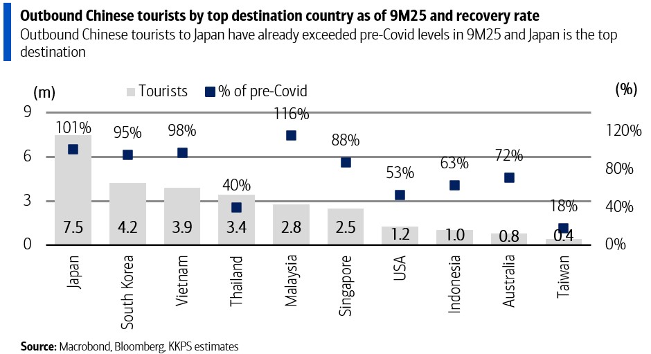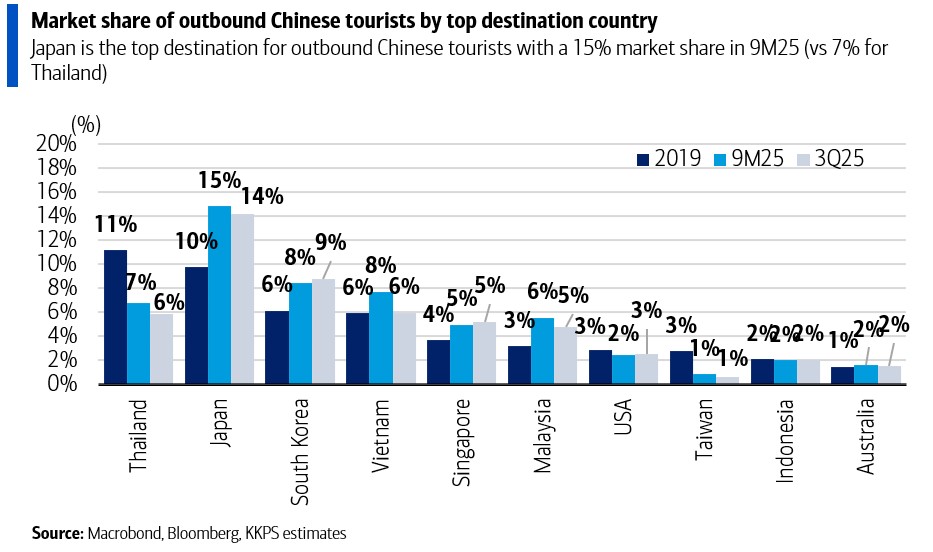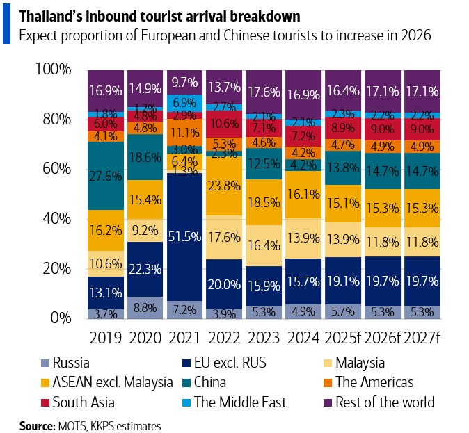 จากฐานที่ต่ำในปี 2025 อันเนื่องมาจากจำนวนนักท่องเที่ยวจีนที่อ่อนแอ การท่องเที่ยวในปี 2026 น่าจะเห็นสถานการณ์พลิกฟื้น จากการที่การท่องเที่ยวขาออกของจีนอาจเปลี่ยนทิศทางจากญี่ปุ่นมาสู่ประเทศไทย หลังจากข้อพิพาทล่าสุดกับญี่ปุ่น ส่งผลให้ บริษัทหลักทรัพย์ เกียรตินาคินภัทร จำกัด (มหาชน) (KKPS) ประเมินว่าจำนวนนักท่องเที่ยวรวมจะฟื้นตัวและเติบโต 4% เป็น 34.4 ล้านคนในปี 2026 โดยมีโอกาสเพิ่มเติมจากนักท่องเที่ยวจีน โดย KKPS คาดว่าส่วนแบ่งตลาดของไทยในนักท่องเที่ยวจีนขาออกจะเพิ่มจาก 7% ในช่วงเก้าเดือนแรกของปีนี้ เข้าใกล้ระดับ 11% ที่เคยเห็นในปี 2019 ซึ่งจะช่วยลดช่องว่างกับญี่ปุ่นที่มีส่วนแบ่งตลาด 15% ในช่วงเก้าเดือนแรกของปีนี้ โดยในเดือนธันวาคม ส่วนแบ่งตลาดของญี่ปุ่นลดลงจาก 15% เหลือ 13% ขณะที่ของไทยเพิ่มจาก 7% เป็น 9% นอกจากนี้ บริษัทท่าอากาศยานไทย จำกัด (มหาชน) หรือ AOT ได้ประกาศตารางการบินฤดูหนาวล่าสุด ซึ่งบ่งชี้ถึงจำนวนเที่ยวบินที่เพิ่มขึ้น 17% จากปีที่แล้ว