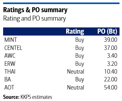โดยรวมแล้ว KKPS มองว่า CENTEL และ BA เป็นหุ้นเด่นของกลุ่ม โดยให้น้ำหนักเชิงบวกกับ CENTEL จากแนวโน้มการเติบโตที่แข็งแกร่งและการเติบโตของกำไรที่ดี ขณะที่ BA มีมูลค่าที่ไม่แพงที่อัตราส่วนราคาต่อกำไรของหุ้น (PER) ที่ 8 เท่า อัตราผลตอบแทนจากส่วนของผู้ถือหุ้น (ROE) ที่ 22% และอัตราผลตอบแทนเงินปันผลที่ 8% พร้อมโอกาสการเติบโตเพิ่มเติมจากการปรับขึ้น PSC และการต่ออายุสัมปทานธุรกิจขนส่งสินค้าและบริการภาคพื้นดินที่สนามบินสุวรรณภูมิ