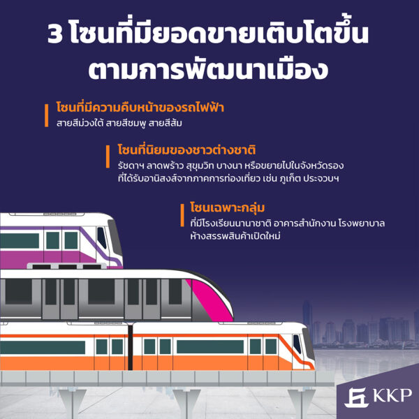 แม้ภาพรวมยังท้าทาย แต่หลายทำเลยังมีโอกาสเติบโตได้ดี โดยเฉพาะพื้นที่รับอานิสงส์จากรถไฟฟ้าสายใหม่ เช่น สายสีม่วงใต้ สีชมพู และสีส้ม รวมถึงโซนที่ได้รับความนิยมจากชาวต่างชาติ ได้แก่ รัชดาฯ ลาดพร้าว สุขุมวิท บางนา หรือจังหวัดท่องเที่ยว เช่น ภูเก็ต และประจวบคีรีขันธ์ที่มียอดขายที่ดี โซนที่มีโรงเรียนนานาชาติ อาคารสำนักงาน โรงพยาบาล ห้างสรรพสินค้าที่เปิดใหม่ หรือกำลังปรับปรุง มักจะเห็นการขยายตัวของธุรกิจโดยรอบและสร้างยอดขายแตกต่างจากโซนอื่นๆ