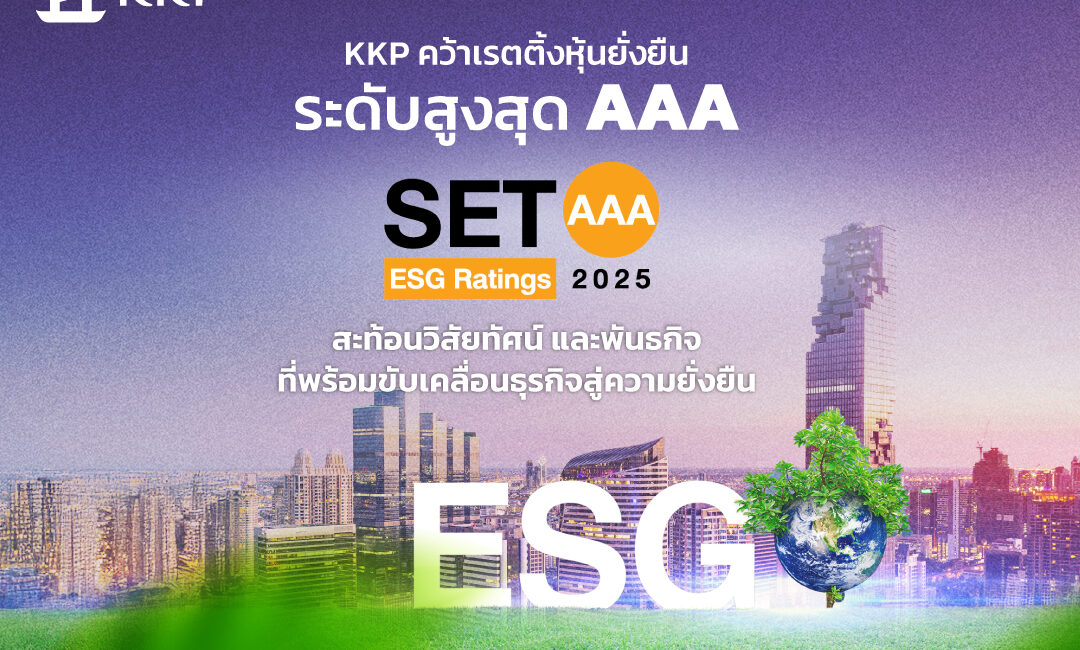 กลุ่มธุรกิจการเงินเกียรตินาคินภัทร (KKP) ประกาศความสำเร็จในการประเมินหุ้นยั่งยืน SET ESG Ratings ประจำปี 2568 ก้าวสู่ระดับสูงสุด AAA ครั้งแรก เป็นเครื่องยืนยันความมุ่งมั่นของทีมงาน KKP ทุกภาคส่วน ในการขับเคลื่อนการดำเนินธุรกิจการเงินอย่างรับผิดชอบและยั่งยืน เพื่อสร้างคุณค่าให้แก่ผู้มีส่วนได้เสียอย่างรอบด้าน