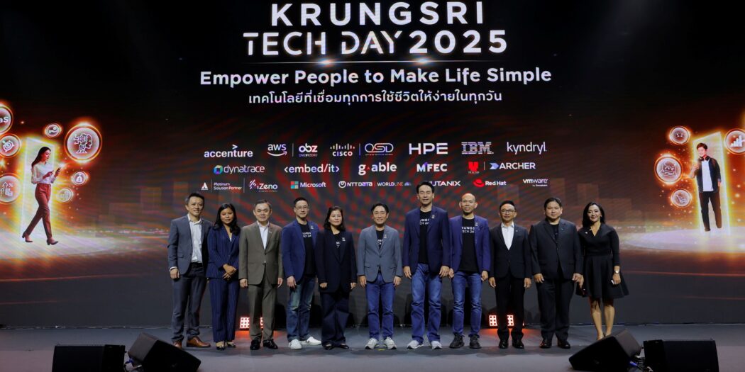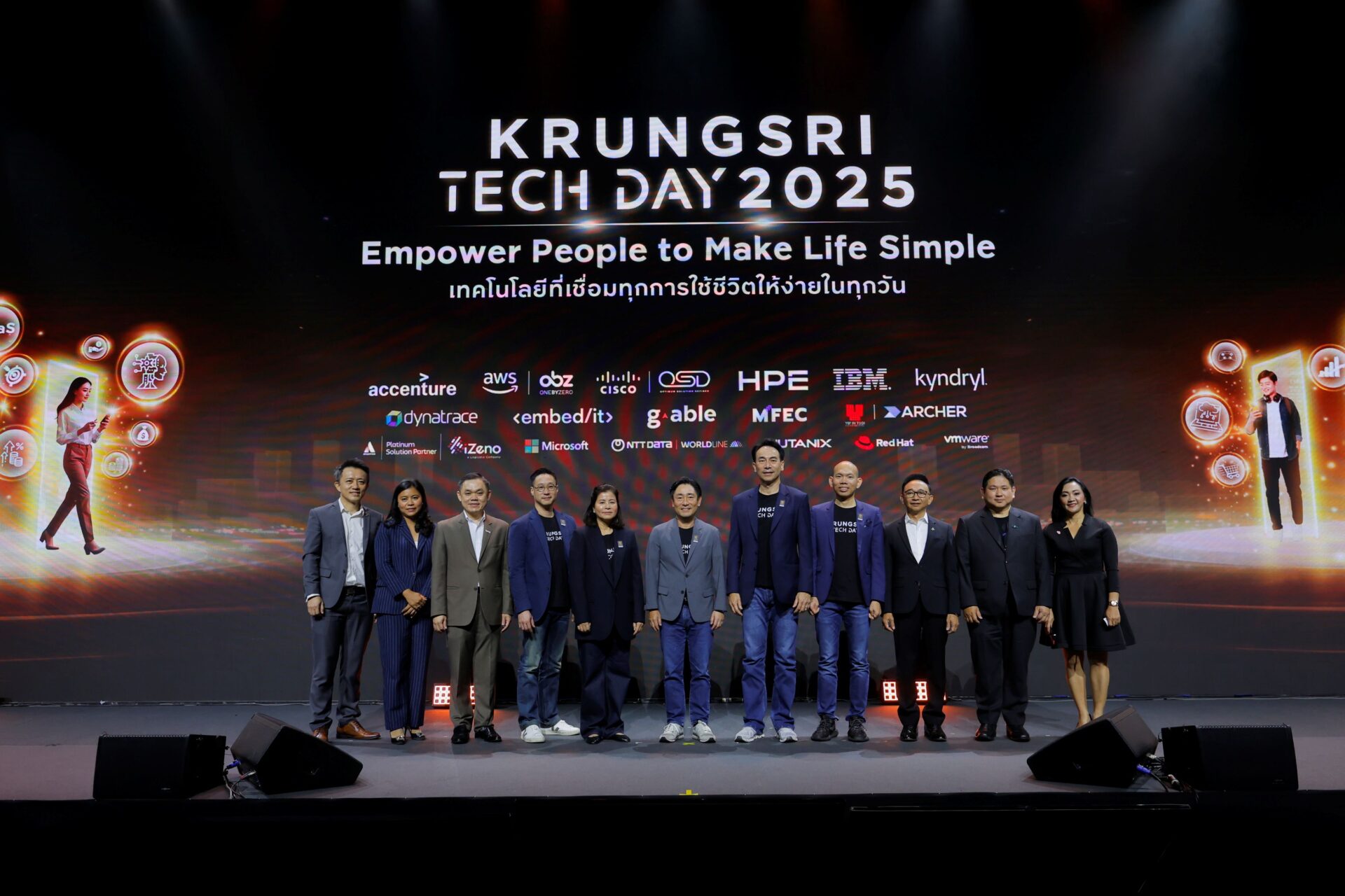 กรุงศรี นำโดย นายเคนอิจิ ยามาโตะ (กลาง) กรรมการผู้จัดการใหญ่และประธานเจ้าหน้าที่บริหาร พร้อมด้วย นางสาวสายสุนีย์ หาญประเทืองศิลป์ (ที่ 5 จากซ้าย) ประธานกลุ่มสนับสนุนธุรกิจด้านเทคโนโลยีสารสนเทศและดิจิทัล นายพชร วันรัตน์เศรษฐ (ที่ 4 จากซ้าย) ประธานคณะเจ้าหน้าที่ด้านเทคโนโลยีสารสนเทศ นายตุลย์ โรจน์เสรี (ที่ 5 จากขวา) ประธานคณะเจ้าหน้าที่ด้านข้อมูลและการวิเคราะห์ระดับองค์กร และนายรถพร เอกบุตร (ที่ 4 จากขวา) ประธานคณะเจ้าหน้าที่ด้านดิจิทัลและนวัตกรรม ร่วมด้วยพันธมิตรบริษัทสายเทคชั้นนำอย่าง AWS Thailand, Cisco Systems (Thailand), Kyndryl Thailand & Vietnam, IBM Thailand, Hewlett Packard Enterprise (HPE) และ Accenture Thailand โชว์วิสัยทัศน์ในการขับเคลื่อนนวัตกรรมด้านไอทีและดิจิทัลในงาน Krungsri Tech Day 2025: Empower People to Make Life Simple ณ สามย่านมิตรทาวน์
