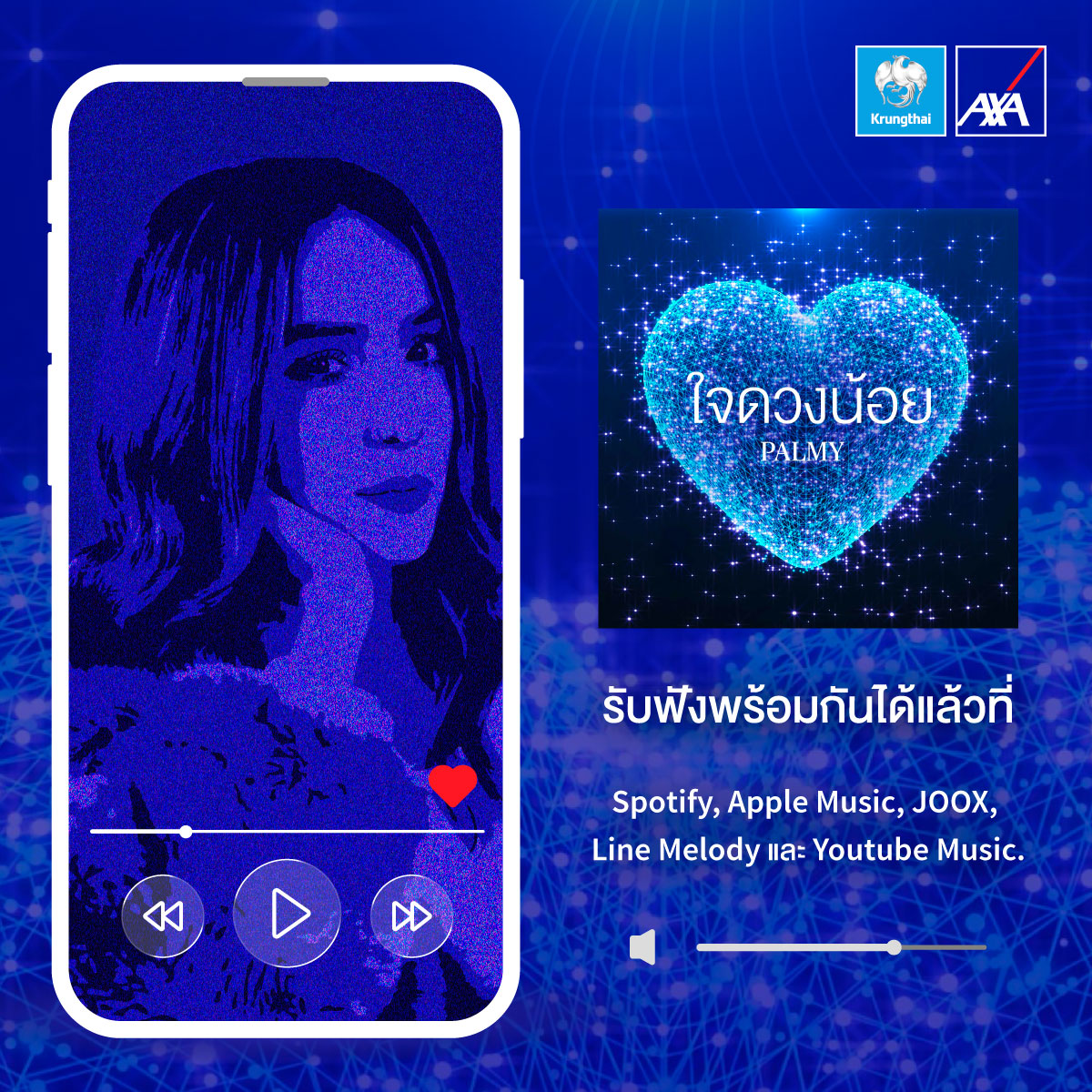 บมจ.กรุงไทย-แอกซ่า ประกันชีวิต โดยคุณบุปผาวดี โอวรารินท์ ประธานเจ้าหน้าที่บริหารฝ่ายการตลาด เปิดตัวเพลงแรกของบริษัทฯ “ใจดวงน้อย” ซึ่งถ่ายทอดเสียงเพลงโดย คุณปาล์มมี่-อีฟ ปานเจริญ ในวันวาเลนไทน์ ผ่านแนวเพลง Synth-Pop ที่ทันสมัย เข้าถึงง่าย แต่เปี่ยมด้วยความหมายที่อบอุ่น เพื่อสื่อสารถึงความมุ่งมั่นของบริษัทฯ ที่เป็นเพื่อนคู่คิด และเคียงข้างลูกค้าในทุกช่วงชีวิต ตลอดจนขอบคุณทุกความไว้วางใจที่ไม่มีวันเปลี่ยนแปลง สอดคล้องเป้าหมายสูงสุดของบริษัทฯ ที่พร้อมอยู่เคียงข้างทุกความเชื่อมั่น ดูแลกันตลอดไป