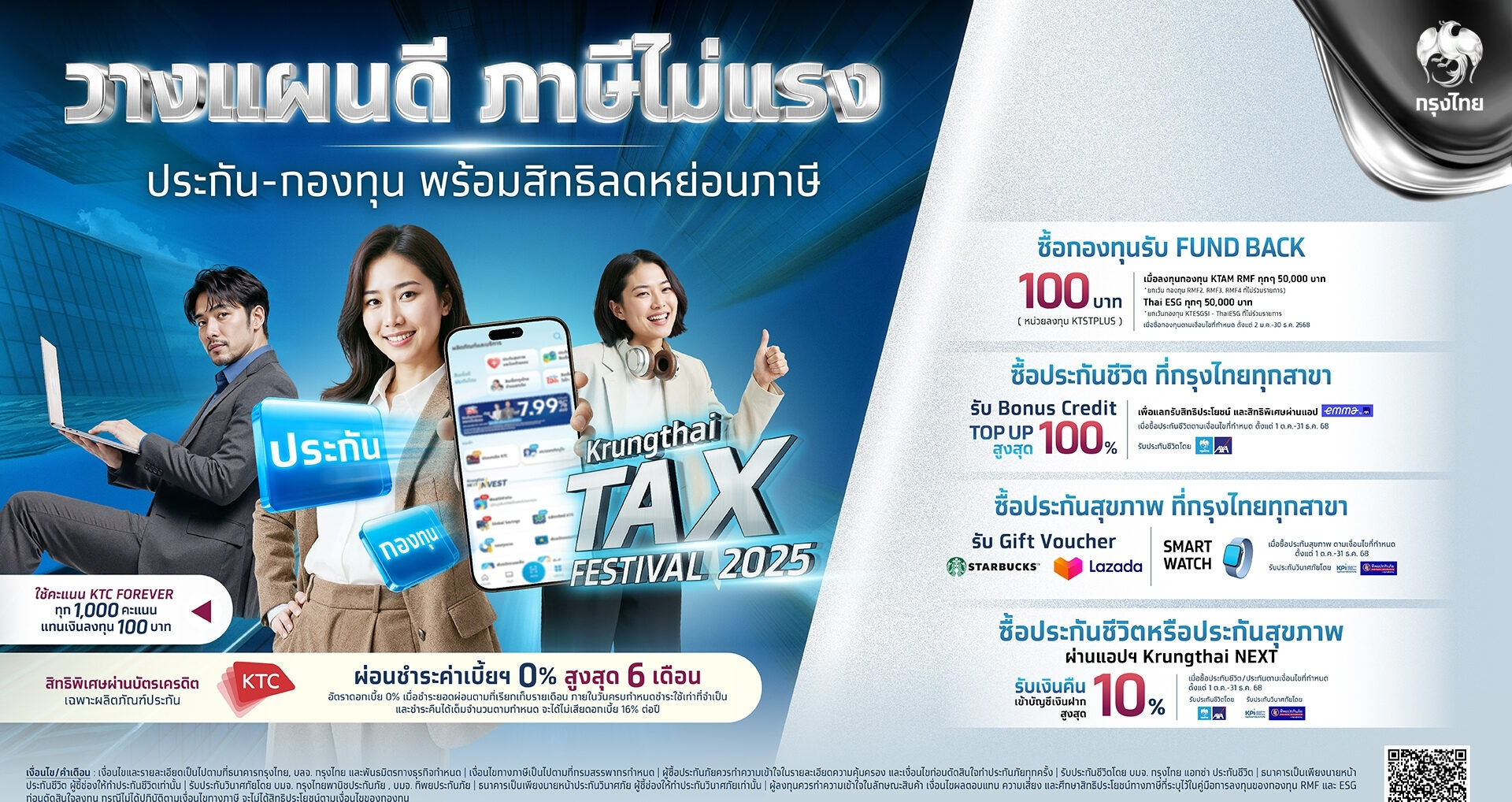 ผู้ที่สนใจ สามารถเลือกลงทุนและซื้อความคุ้มครองได้ง่ายๆ ผ่านแอปพลิเคชัน Krungthai NEXT หรือธนาคารกรุงไทยทุกสาขา ตั้งแต่วันนี้ – 31 ธันวาคม 2568 พิเศษสำหรับผู้ถือบัตรเครดิต KTC รับสิทธิประโยชน์เพิ่มเติม เมื่อซื้อผลิตภัณฑ์การลงทุนและประกันภัย (ใช้เท่าที่จะเป็นและชำระคืนได้เต็มจำนวนตามกำหนดจะได้ไม่เสียดอกเบี้ย 16% ต่อปี) โดยข้อกำหนดและเงื่อนไขเป็นไปตามที่ธนาคารฯ กำหนด