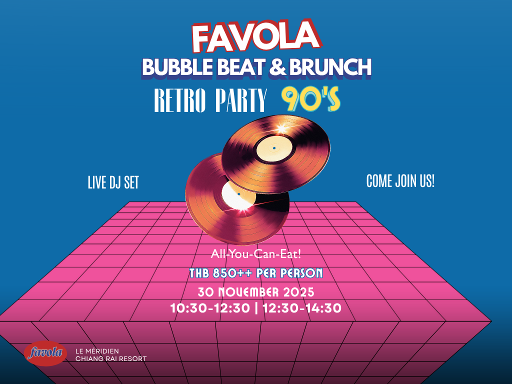 ห้องอาหารฟาโวล่า ห้องอาหารอิตาเลียนซิกเนเจอร์ ริมแม่น้ำกก ณ โรงแรม เลอ เมอริเดียน เชียงราย รีสอร์ท ขอเชิญชวนทุกท่านมาเพิ่มระดับความมันส์และย้อนเวลากลับไปในอดีต เตรียมพบกับงานบรันช์ที่รับประกันความสนุกและจัดเต็มไปด้วยอาหาร: “Favola Bubble Beat & Brunch: Retro Party 90’s”