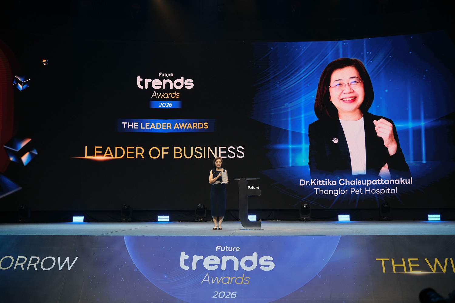 สพ.ญ.กฤติกา ชัยสุพัฒนากุล ประธานกรรมการบริหาร โรงพยาบาลสัตว์ทองหล่อ เข้ารับรางวัลเชิดชู เกียรติสุดยอดผู้นำธุรกิจแห่งปี "Leader of Business" ในสาขา The Leader Awards จากเวที Future Trends Awards 2026 จัดโดย Future Trends สื่อชั้นนำด้านข้อมูลข่าวสารและเทรนด์ธุรกิจของไทย รางวัลดังกล่าวสะท้อนถึงวิสัยทัศน์ความโดดเด่นในการบริหารจัดการอย่างสร้างสรรค์ และความสามารถ ในการปรับตัวรับความเปลี่ยนแปลงของโลกอนาคตได้อย่างดีเยี่ยม ถือเป็นการเชิดชูเกียรติแก่ รพส.ทองหล่อ ในฐานะผู้นำสถานพยาบาลสัตว์ชั้นนำของไทย ที่พร้อมก้าวสู่การเป็นระบบนิเวศ การดูแล สัตว์เลี้ยง (Pet Care Ecosystem) ที่ครบวงจรที่สุดในภูมิภาค โดยมุ่งขับเคลื่อนองค์กรด้วยนวัตกรรม เพื่อยกระดับ มาตรฐานการดูแลสุขภาพสัตว์เลี้ยงให้ก้าวล้ำไปสู่อนาคตอย่างยั่งยืน งานดังกล่าวจัดขึ้น ณ ภิรัชฮอลล์ ศูนย์นิทรรศการและการประชุมไบเทค บางนา