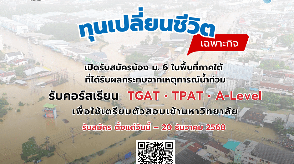 มูลนิธิเลิร์น โดย LEARN Corporation เปิดรับสมัครนักเรียน “ทุนเปลี่ยนชีวิต รอบเฉพาะกิจ” เพื่อช่วยให้นักเรียนชั้น ม.6 ในพื้นที่ภาคใต้ที่รับผลกระทบจากสถานการณ์อุทกภัย ได้มีโอกาสเตรียมตัวสอบเข้ามหาวิทยาลัยตามเป้าหมายที่ตั้งใจได้สำเร็จ