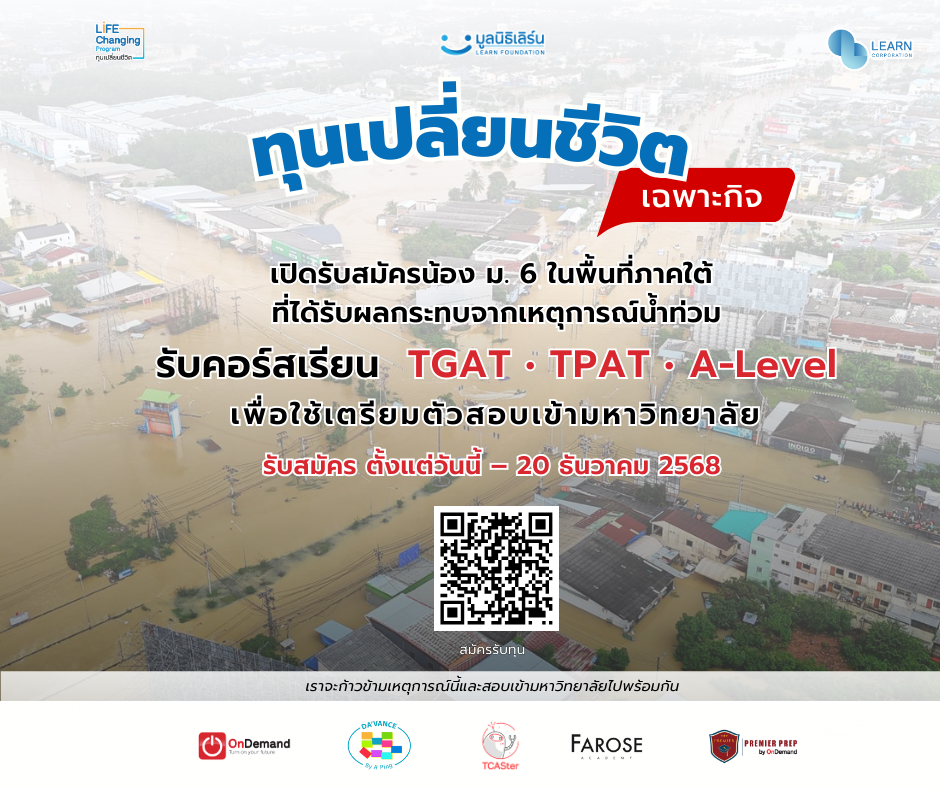 จากสถานการณ์อุทกภัยในพื้นที่ภาคใต้ที่ส่งผลกระทบกับหลายครอบครัว LEARN Corporation ตระหนักถึงผลกระทบต่อเนื่องที่เป็นอุปสรรคด้านการศึกษาของนักเรียนชั้น ม. 6 ทั้งด้านความพร้อมและการเข้าถึงทรัพยากรการเรียนรู้ เพื่อช่วยบรรเทาผลกระทบและให้นักเรียนสามารถเดินหน้าตามแผนการศึกษาได้อย่างต่อเนื่อง มูลนิธิเลิร์นจึงเปิดโครงการ “ทุนเปลี่ยนชีวิต รอบเฉพาะกิจ” สำหรับนักเรียน ม.6 ที่ได้รับผลกระทบจากอุทกภัยภาคใต้ โดยนักเรียนจะได้รับคอร์สเรียนเตรียมสอบโดยไม่มีค่าใช้จ่ายและไม่มีภาระผูกพัน เพื่อสนับสนุนให้นักเรียนสามารถก้าวต่อไปบนเส้นทางการศึกษาต่อตามที่ตั้งใจได้อย่างมั่นคง