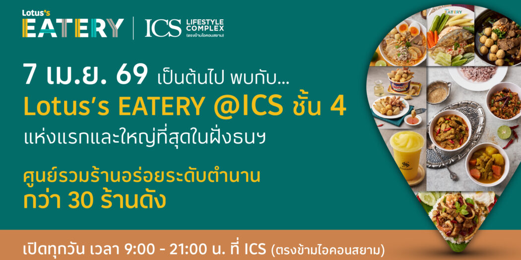 ไอซีเอส ผนึกกำลัง “Lotus’s Eatery” เปิดศูนย์รวมร้านอาหารดังระดับตำนานกว่า 30 ร้าน สร้าง Food Destination แห่งใหม่ของฝั่งธนบุรี ตอบกลยุทธ์การสร้างเมืองของไอคอนสยามอย่างสมบูรณ์แบบ พร้อมเดินเกมรุก Food Ecosystem ส่งผลขยายฐานลูกค้าครบเซ็กเมนต์ ฉลองเปิดร้าน 7 เม.ย. 2569 นี้ จัดแคมเปญยิ่งใหญ่ แจกสิทธิ์ทานอาหารฟรี 5,000 สิทธิ์ สิทธิ์ละ 200 บาท  ที่ Lotus’s Eatery @ ICS