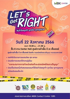ศูนย์การค้าเอ็ม บี เค เซ็นเตอร์ ร่วมกับ กระทรวงพาณิชย์ โดยกรมทรัพย์สินทางปัญญา จัดงาน “Let’s Get Right สินค้าไทยถูกใจ ถูกต้อง ถูกกฎหมาย” ภายในงานพบสาระความรู้มากมาย จากเสวนาในหัวข้อ ผลกระทบจากการจำหน่ายสินค้าละเมิดทรัพย์สินทางปัญญา โดย วิทยากรจาก กรมทรัพย์สินทางปัญญา สำนักงานตำรวจแห่งชาติ และ กรมศุลกากร พร้อมชมนิทรรศการให้ความรู้ เรื่องการใช้สินค้าลิขสิทธิ์ และร่วมเดินรณรงค์ใช้สินค้าไทย ถูกใจ ถูกต้อง ถูกกฎหมาย พร้อมร่วมชมการแสดง โขนเรื่องรามเกียรติ์ ชุดยกรบ อันสื่อถึงการต่อสู้เพื่อร่วมกันต่อต้านสินค้าละเมิดทรัพย์สินทางปัญญาในวันอังคารที่ 22 สิงหาคม 2566 ตั้งแต่เวลา 10.00 น.- 21.00 น. ณ ชั้น G ลานเซ็นเตอร์ ฮอลล์ ศูนย์การค้าเอ็ม บี เค เซ็นเตอร์