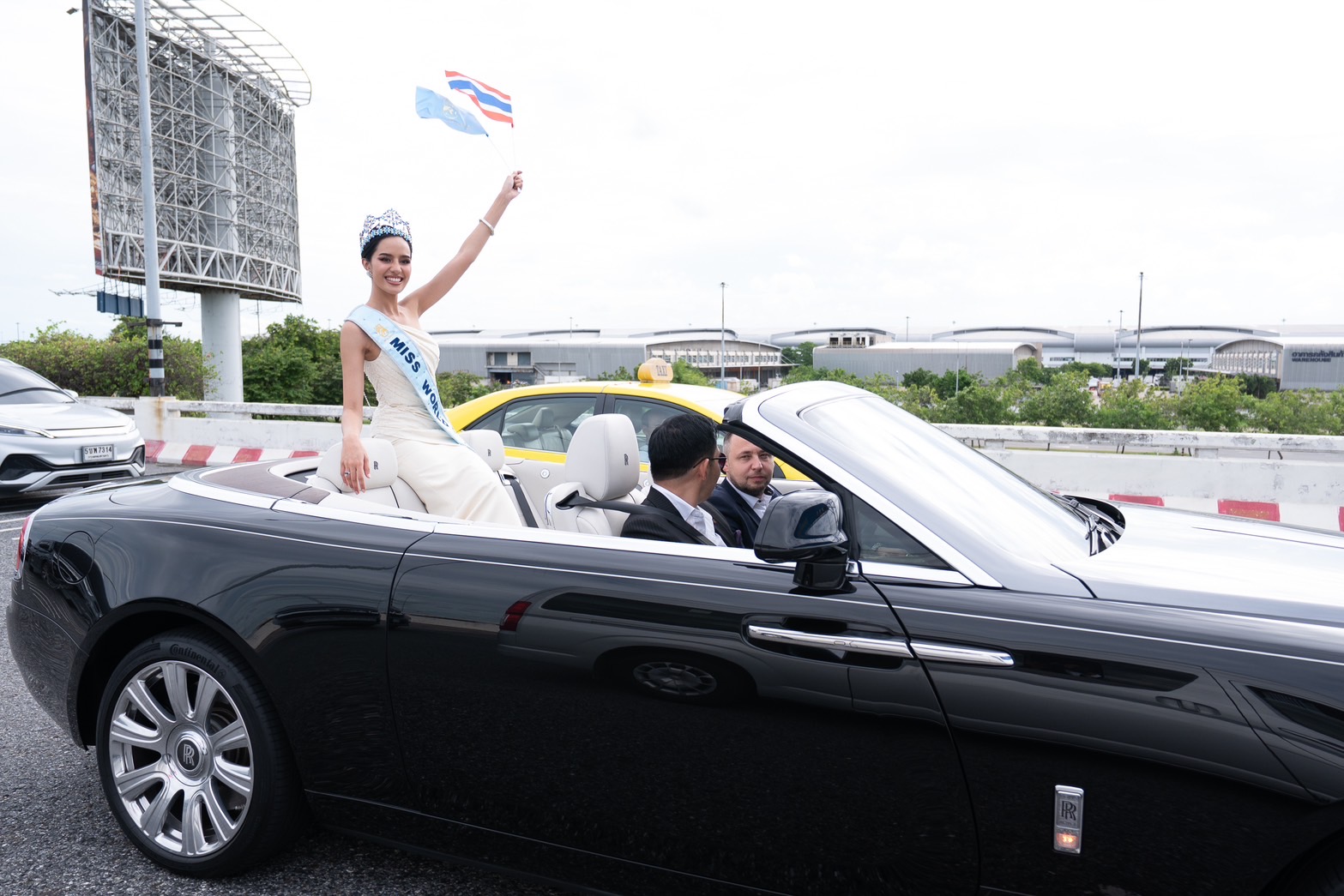 เป็นธรรมเนียมปฎิบัติไปแล้ว เมื่อมีคนไทยไปสร้างชื่อเสียงระดับโลกและเดินทางกลับสู่มาตุภูมิ มักจะมีการจัดขบวนต้อนรับอย่างสมเกียรติ สำหรับครั้งนี้รถยนต์ที่ได้รับเลือกให้เป็นพาหนะหลักในขบวนแห่ต้อนรับ มิสเวิลด์ 2025 คือ โรลส์-รอยซ์ รุ่น ‘ดอว์น’ รถยนต์เปิดประทุนสี่ที่นั่งสุดหรู ที่ปัจจุบันนับเป็นรุ่นหายากในตลาดโลก ด้วยราคาประเมินกว่า 40 ล้านบาท พร้อมกันนี้ยังมีทีมผู้ช่วยขับจาก ซิกท์ รถเช่าประเทศไทย มาช่วยอำนวยความสะดวก ท่ามกลางบรรยากาศผู้คนนับหมื่นที่มารอต้อนรับอย่างคึกคัก