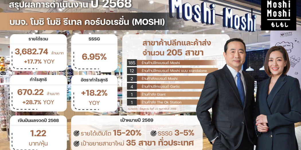 ‘บมจ. โมชิ โมชิ รีเทล คอร์ปอเรชั่น’ หรือ MOSHI ตอกย้ำความเป็นผู้นำในธุรกิจร้านค้าปลีกสินค้าไลฟ์สไตล์รายใหญ่ของประเทศไทย ประกาศผลงานปี 2568 ทุบสถิติสูงสุดเป็นประวัติการณ์ (New High) ต่อเนื่อง กวาดรายได้จากการดำเนินงาน 3,664.35 ล้านบาท เพิ่มขึ้น 17.8% และมีกำไรสุทธิ 670.22 ล้านบาท เพิ่มขึ้น 28.7% ดัน SSSG เติบโตอย่างแข็งแกร่งที่ 6.95% รับอานิสงส์ช่วง High Season และความสำเร็จของสินค้าลิขสิทธิ์ยอดนิยม บอร์ดไฟเขียวเสนอจ่ายเงินปันผล พร้อมปรับสัดส่วน Payout Ratio จาก 50% เพิ่มขึ้นเป็น 60% รับปันผล 1.22 บาทต่อหุ้น พร้อมปักธงปี 2569 รุกตลาดต่อเนื่องตั้งเป้ารายได้โต 15-20% เตรียมงบลงทุน 420 ล้านบาท เสริมแกร่งคลังสินค้าใหม่และขยายสาขาเพิ่ม 35 แห่ง