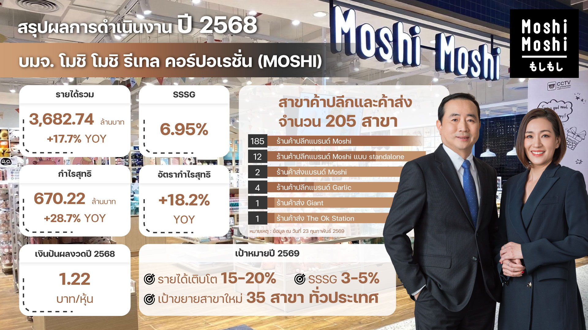 ‘บมจ. โมชิ โมชิ รีเทล คอร์ปอเรชั่น’ หรือ MOSHI ตอกย้ำความเป็นผู้นำในธุรกิจร้านค้าปลีกสินค้าไลฟ์สไตล์รายใหญ่ของประเทศไทย ประกาศผลงานปี 2568 ทุบสถิติสูงสุดเป็นประวัติการณ์ (New High) ต่อเนื่อง กวาดรายได้จากการดำเนินงาน 3,664.35 ล้านบาท เพิ่มขึ้น 17.8% และมีกำไรสุทธิ 670.22 ล้านบาท เพิ่มขึ้น 28.7% ดัน SSSG เติบโตอย่างแข็งแกร่งที่ 6.95% รับอานิสงส์ช่วง High Season และความสำเร็จของสินค้าลิขสิทธิ์ยอดนิยม บอร์ดไฟเขียวเสนอจ่ายเงินปันผล พร้อมปรับสัดส่วน Payout Ratio จาก 50% เพิ่มขึ้นเป็น 60% รับปันผล 1.22 บาทต่อหุ้น พร้อมปักธงปี 2569 รุกตลาดต่อเนื่องตั้งเป้ารายได้โต 15-20% เตรียมงบลงทุน 420 ล้านบาท เสริมแกร่งคลังสินค้าใหม่และขยายสาขาเพิ่ม 35 แห่ง