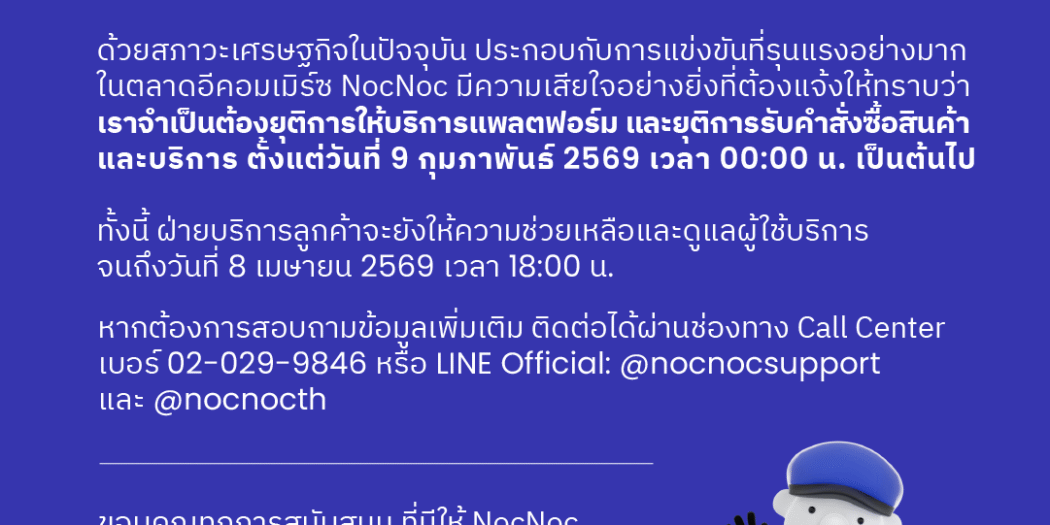 ตลอดระยะเวลาที่ผ่านมา NocNoc มีความตั้งใจ และพยายามอย่างเต็มที่ในการพัฒนาแพลตฟอร์ม เพื่อส่งมอบบริการที่จริงใจ และมุ่งมั่นในการสร้างความเป็นอยู่ที่ดีขึ้นให้กับลูกค้า ร้านค้าพาร์ทเนอร์ พันธมิตร และผู้ประกอบการทุกท่าน แต่ด้วยสภาวะเศรษฐกิจในปัจจุบัน ประกอบกับการแข่งขันที่รุนแรงอย่างมากในตลาดอีคอมเมิร์ซ บริษัทได้พิจารณาไตร่ตรองอย่างถี่ถ้วนแล้ว และมีความเสียใจอย่างยิ่งที่ต้องแจ้งให้ท่านทราบว่า บริษัทจำเป็นต้องยุติการให้บริการแพลตฟอร์ม NocNoc และยุติการรับคำสั่งซื้อสินค้าและบริการตั้งแต่วันที่ 9 กุมภาพันธ์ 2569 เวลา 00:00 น. เป็นต้นไป