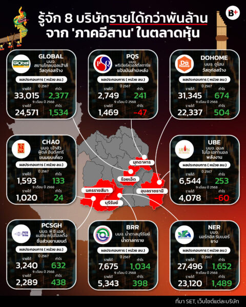 กลุ่มแรกคือธุรกิจวัสดุก่อสร้างรายใหญ่อย่าง บมจ. สยามโกลบอลเฮ้าส์ (GLOBAL) จากจังหวัดร้อยเอ็ด ทำรายได้ปี 2567 สูงถึง 33,015 ล้านบาท กำไร 2,377 ล้านบาท ส่วน 9 เดือนแรกปี 2568 มีรายได้ 24,571 ล้านบาท กำไร 1,534 ล้านบาท