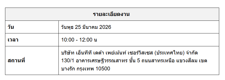 เอ็นทีที เดต้า เพย์เม้นท์ เซอร์วิสเซส (ประเทศไทย) ร่วมกับ มาสเตอร์การ์ด ขอเรียนเชิญสื่อมวลชนทุกท่านเข้าร่วมงานเปิดตัวอย่างเป็นทางการของ ADAPTIS Soundbox ที่มีฟังก์ชัน EMV รองรับการชำระด้วยบัตร เครื่องแรกในประเทศไทย ซึ่งเป็นโซลูชันสำหรับการรับชำระเงินที่ต้นทุนต่ำ มีรูปแบบค่าธรรมเนียมที่เข้าถึงได้ ออกแบบมาเพื่อการรับชำระเงินดิจิทัลที่ปลอดภัยและเชื่อถือได้สำหรับผู้ประกอบการ SME ช่วยลดอุปสรรคและขยายการเข้าถึงบริการการรับชำระเงินด้วยบัตรได้ทั่วประเทศ