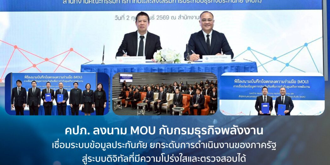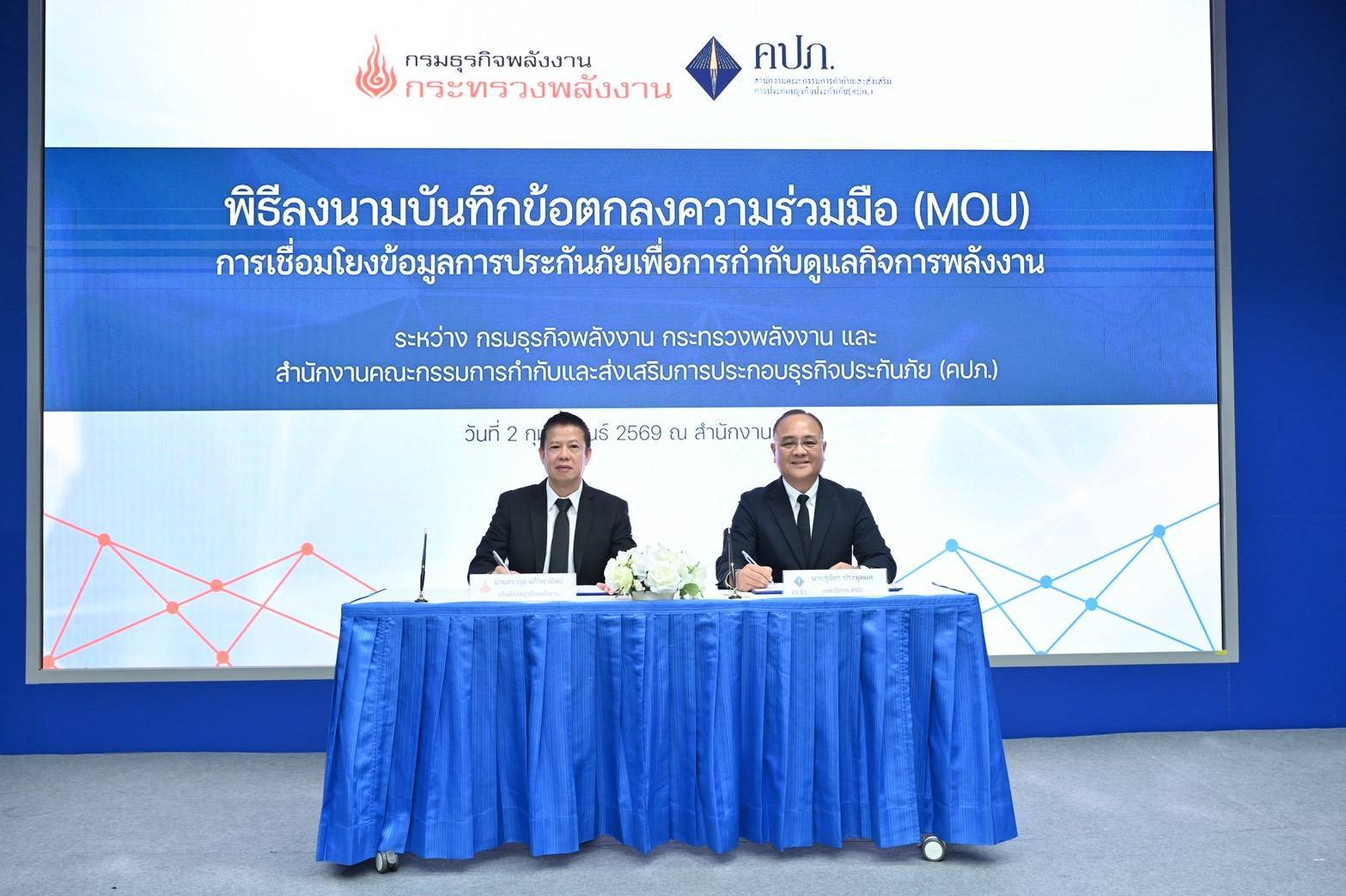 เมื่อวันที่ 2 กุมภาพันธ์ 2569 สำนักงานคณะกรรมการกำกับและส่งเสริมการประกอบธุรกิจประกันภัย (สำนักงาน คปภ.) จัดพิธีลงนามบันทึกข้อตกลงความร่วมมือว่าด้วยการเชื่อมโยงข้อมูลการประกันภัยตามกฎหมายว่าด้วยการควบคุมน้ำมันเชื้อเพลิง เพื่อใช้ประโยชน์ ในการพิจารณาออกใบอนุญาตและกำกับดูแลการประกอบกิจการควบคุมประเภทที่ 3 ระหว่างกรมธุรกิจพลังงาน กระทรวงพลังงาน กับสำนักงาน คปภ. โดยมี นายชูฉัตร ประมูลผล เลขาธิการ คปภ. และ นายสราวุธ แก้วตาทิพย์ อธิบดีกรมธุรกิจพลังงาน เป็นผู้ลงนาม ณ ห้องประชุมสถาบันวิทยาการประกันภัย ชั้น 2 สำนักงาน คปภ.