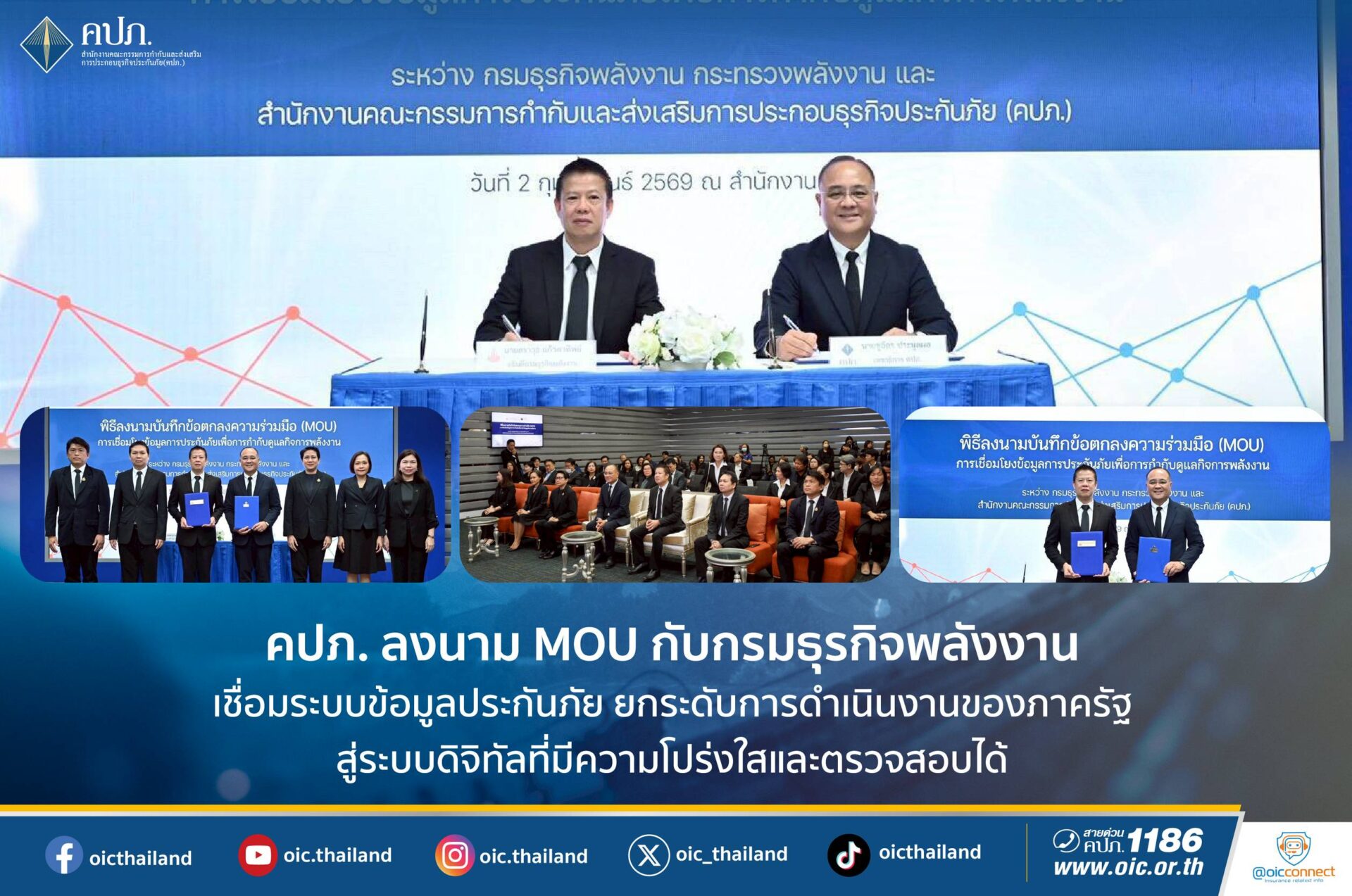 เมื่อวันที่ 2 กุมภาพันธ์ 2569 สำนักงานคณะกรรมการกำกับและส่งเสริมการประกอบธุรกิจประกันภัย (สำนักงาน คปภ.) จัดพิธีลงนามบันทึกข้อตกลงความร่วมมือว่าด้วยการเชื่อมโยงข้อมูลการประกันภัยตามกฎหมายว่าด้วยการควบคุมน้ำมันเชื้อเพลิง เพื่อใช้ประโยชน์ ในการพิจารณาออกใบอนุญาตและกำกับดูแลการประกอบกิจการควบคุมประเภทที่ 3 ระหว่างกรมธุรกิจพลังงาน กระทรวงพลังงาน กับสำนักงาน คปภ. โดยมี นายชูฉัตร ประมูลผล เลขาธิการ คปภ. และ นายสราวุธ แก้วตาทิพย์ อธิบดีกรมธุรกิจพลังงาน เป็นผู้ลงนาม ณ ห้องประชุมสถาบันวิทยาการประกันภัย ชั้น 2 สำนักงาน คปภ.