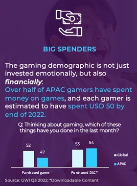 Gaming จึงเป็นโอกาสที่สำคัญของแบรนด์ต่างๆ ในการสื่อสารเข้าถึงลูกค้า โดยที่มากกว่าครึ่งของเกมเมอร์ (ผู้เล่นเกม) ในเอเชียแปซิฟิกเคยใช้เงินในเกมที่เล่นอยู่ และมียอดใช้จ่ายอยู่ที่คนละประมาณ 50USD ในปี 2022