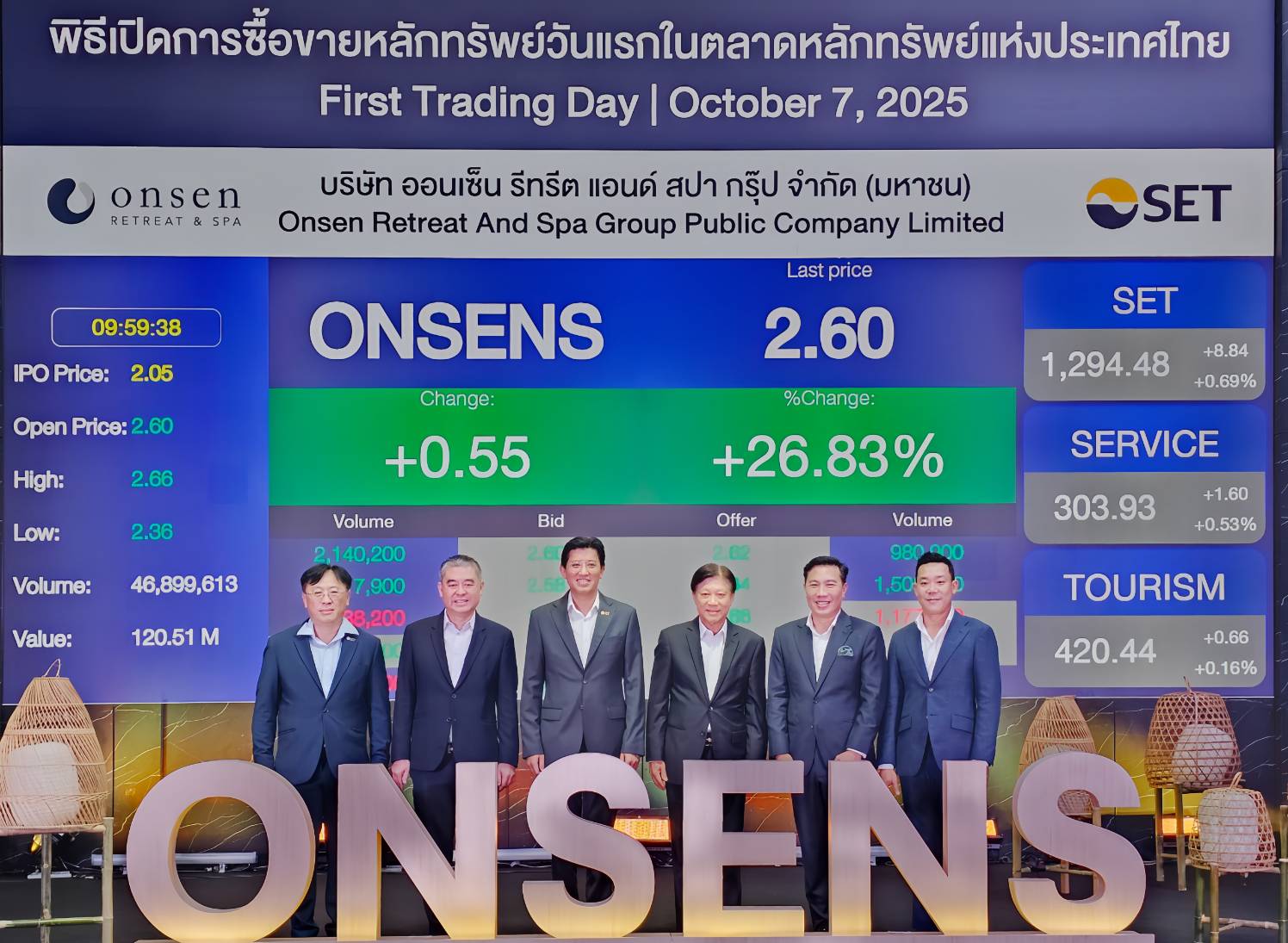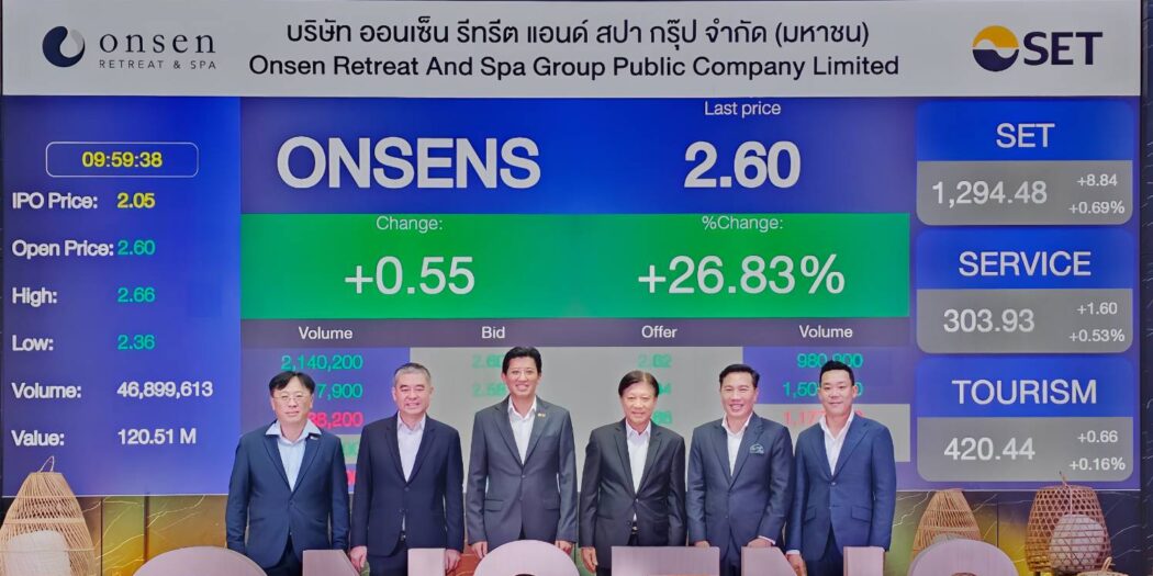 นายสมิทธิ์ เมฆอรุณกมล ประธานเจ้าหน้าที่บริหาร บริษัท ออนเซ็น รีทรีต แอนด์ สปา กรุ๊ป จำกัด (มหาชน) หรือ ONSENS เปิดเผยว่า บริษัทวางเป้าหมายที่จะเป็น “หุ้นเมกะเทรนด์สุขภาพ” ที่มีศักยภาพในการขยายธุรกิจ มีผลประกอบการเติบโตสม่ำเสมอ-มั่นคง และมีฐานะการเงินที่แข็งแกร่งต่อเนื่อง เพื่อสร้างผลตอบแทนที่ดีให้กับผู้ถือหุ้น ตลอดจนผู้มีส่วนได้ส่วนเสียทุกฝ่ายที่เกี่ยวข้อง การระดมทุนและเข้าซื้อขายหลักทรัพย์ในตลาดหลักทรัพย์แห่งประเทศไทย (ตลท.) ถือเป็นก้าวสำคัญที่จะช่วยต่อยอดและเร่งการเติบโตทางธุรกิจตามแผนที่วางไว้ โดยบริษัทฯ ตั้งเป้าหมายการขยาย 8 สาขา ภายใน 3 ปี (2568-2570) โดยราคาหุ้นเปิดตลาดวันแรกที่เข้าซื้อขายในตลาดหลักทรัพย์ เปิดขายที่ราคา 2.60 บาท เหนือจองที่ 26.83%